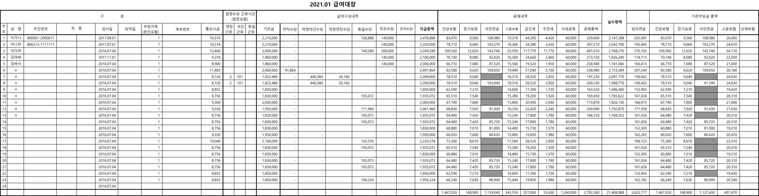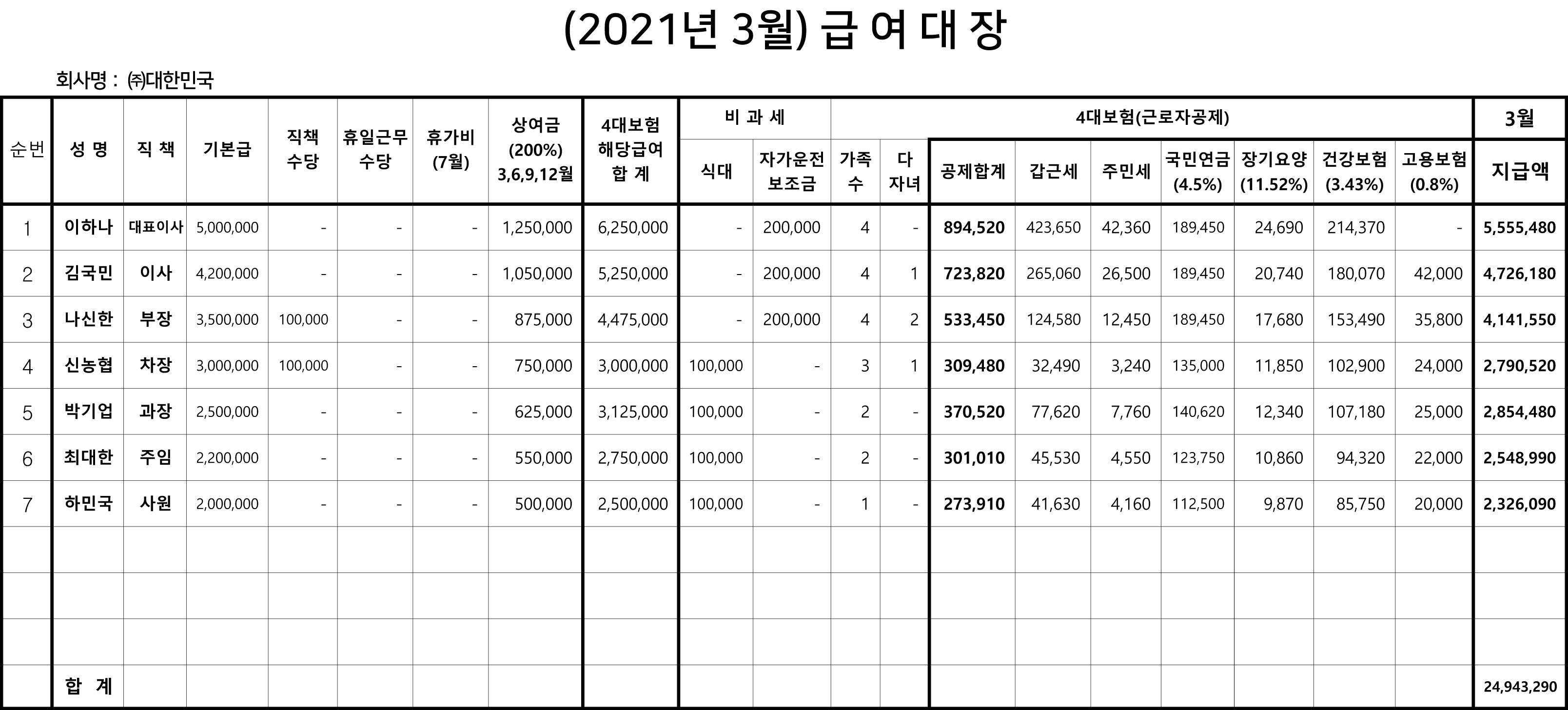 일용직포함 급여대장 양식 5종 무료 다운로드
