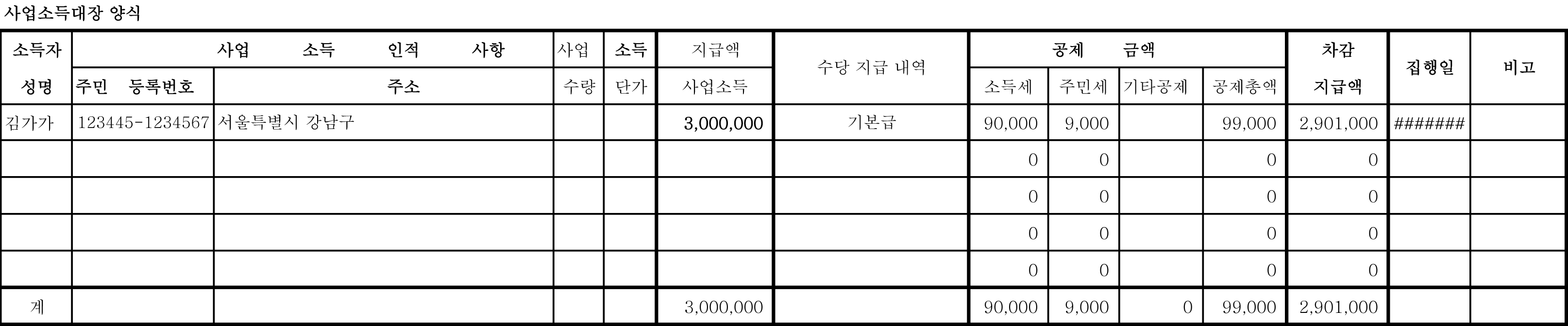 다음은 4대보험 미적용이 되는 사업소득대장 양식입니다. 회사 자체의 산정된 급여 또는 세전 급여를 사업소득 란에 기입하면 소득세와 주민세 공제 총액이 자동으로 계산이 되고 차감지급(최종적으로 직원에게 지급할 금액)이 산정이 되는 파일입니다.