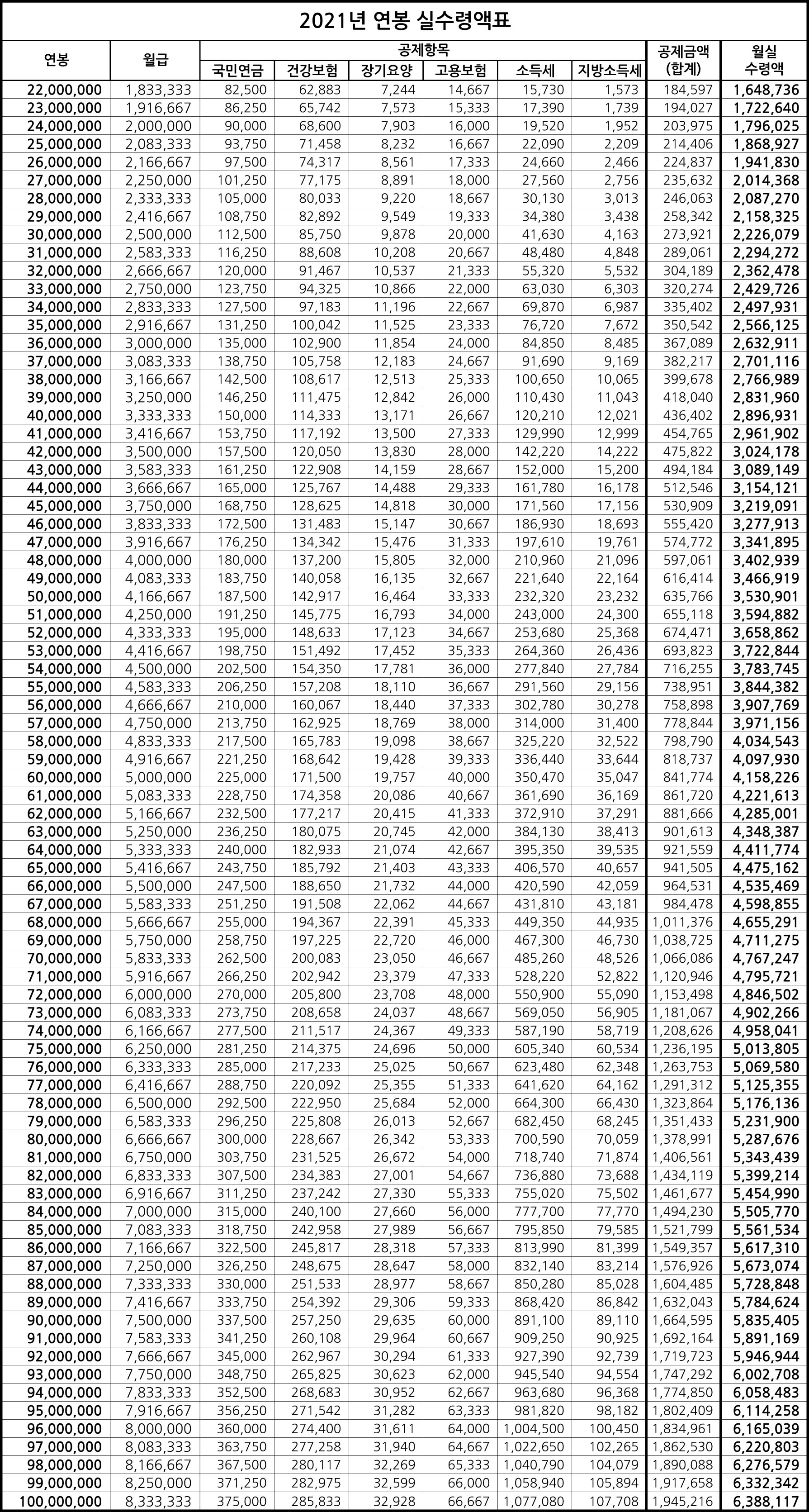 2021년 연봉실수령액 계산된 것을 표가 드디어 나왔습니다.