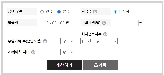 내 평균월급 220만원을 가지고 급여 실수령액 계산기 입력해봤습니다.