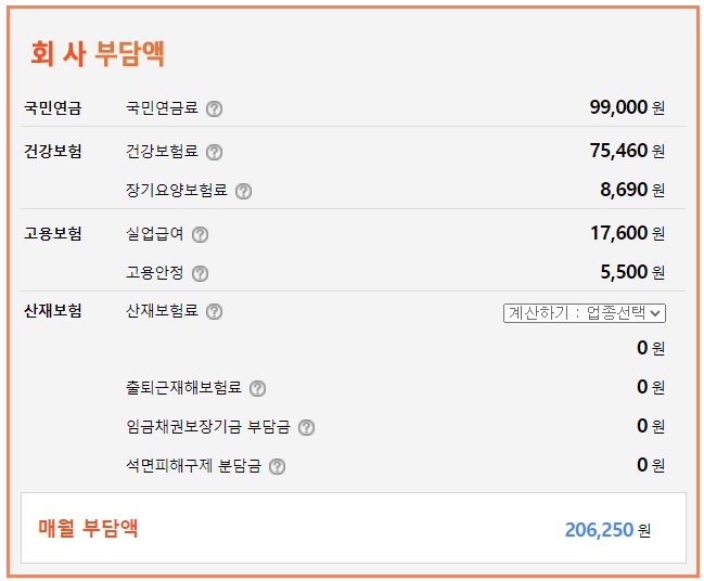 회사에서는 국민연금료와 건강보험료와 장기요양보험료가 포함된 건강보험, 실업급여와 고용안정이 합산된 고용보험, 그리고 산재보험료가 합산되어 매월 20만원이 살짝 넘는 금액을 부담하게 됩니다. 혹시나 싶어서 다른 계산기도 각각 살펴봤습니다.