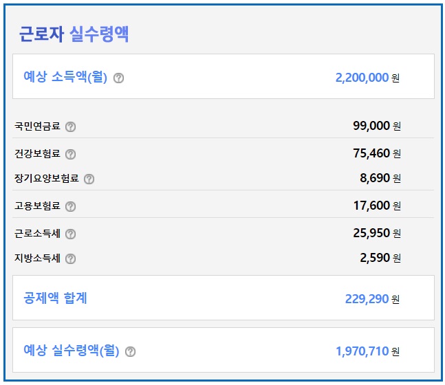 근로자 실수령액이 나옵니다. 월급 220만원을 가정한다면 국민연금료는 9만 9천 원, 건강보험료는 75,460원, 장기요양보험료는 8,690원, 고용보험료는 17,600원, 근로소득세는 25,950원, 지방소득세는 2,590원이 나오며 공제액은 총 229,290원이므로 예상 실수령액은 198만 원 정도가 나오네요~