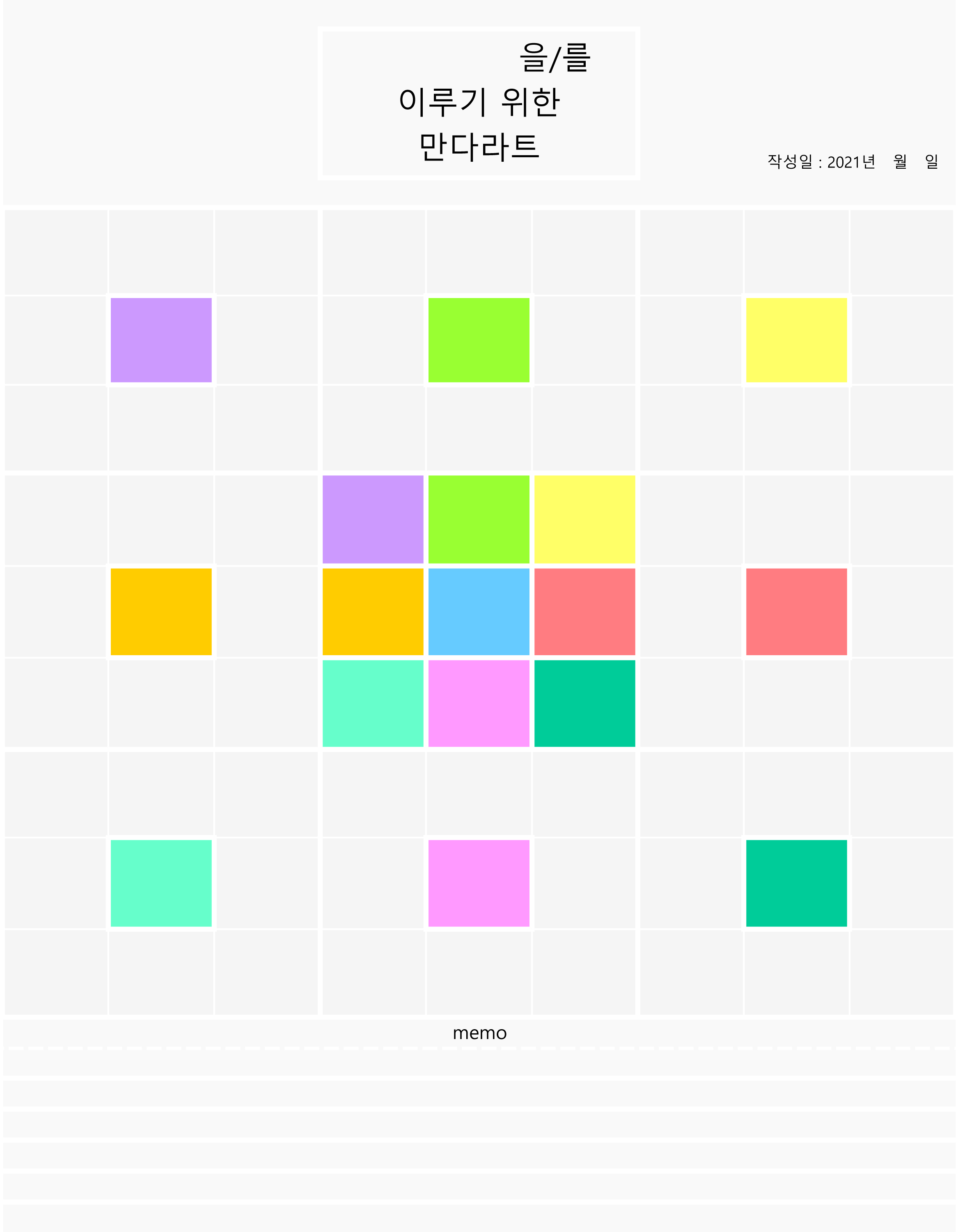 두 번째 만다라트 양식은 세 개의 셀병합 부분을 해지하여, 각각 핵심 목표의 주변 셀이 3개씩 나뉜 서식입니다. 그리고 하단에 추가적인 부분을 입력할 수 있도록 메모 부분을 추가했습니다.