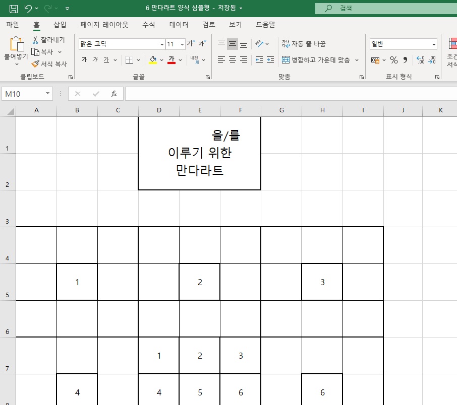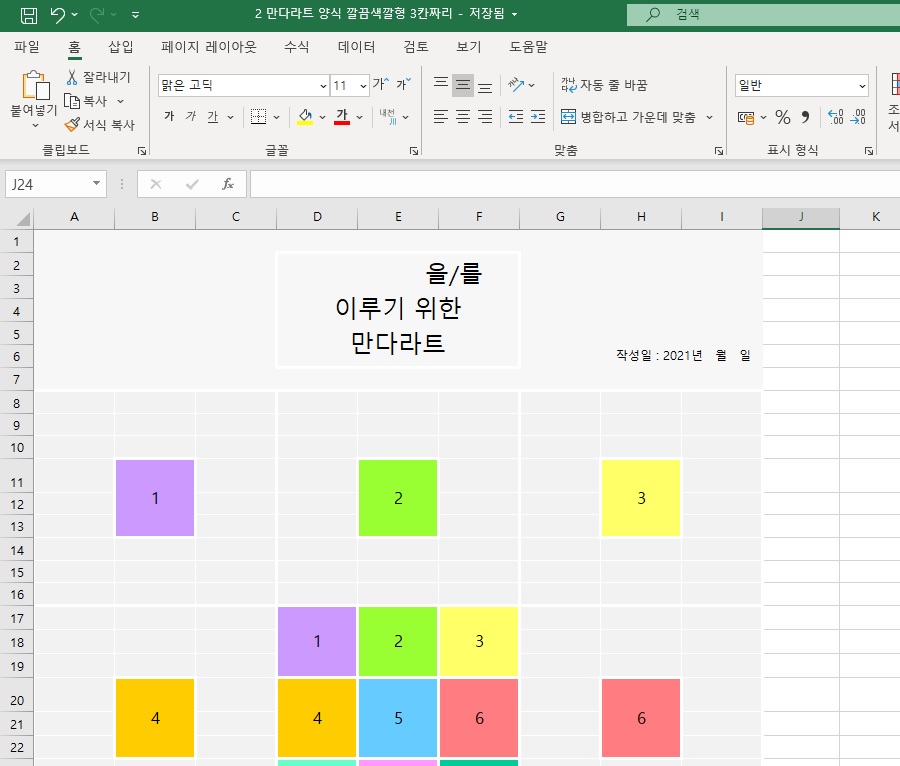 먼저 기입해야할 것은 바로 중앙 쪽에 있는 총 9개의 도형입니다. 이곳에 하나를 기입하면 테두리에 있는 같은 색상의 셀 부분도 자동으로 변경이 됩니다. 파일을 하나씩 살펴보도록 하죠.
