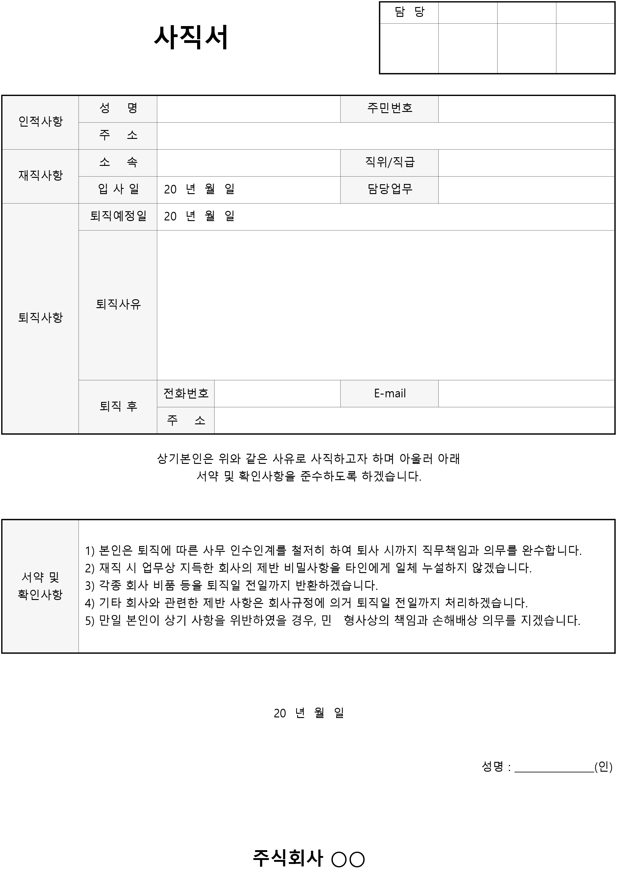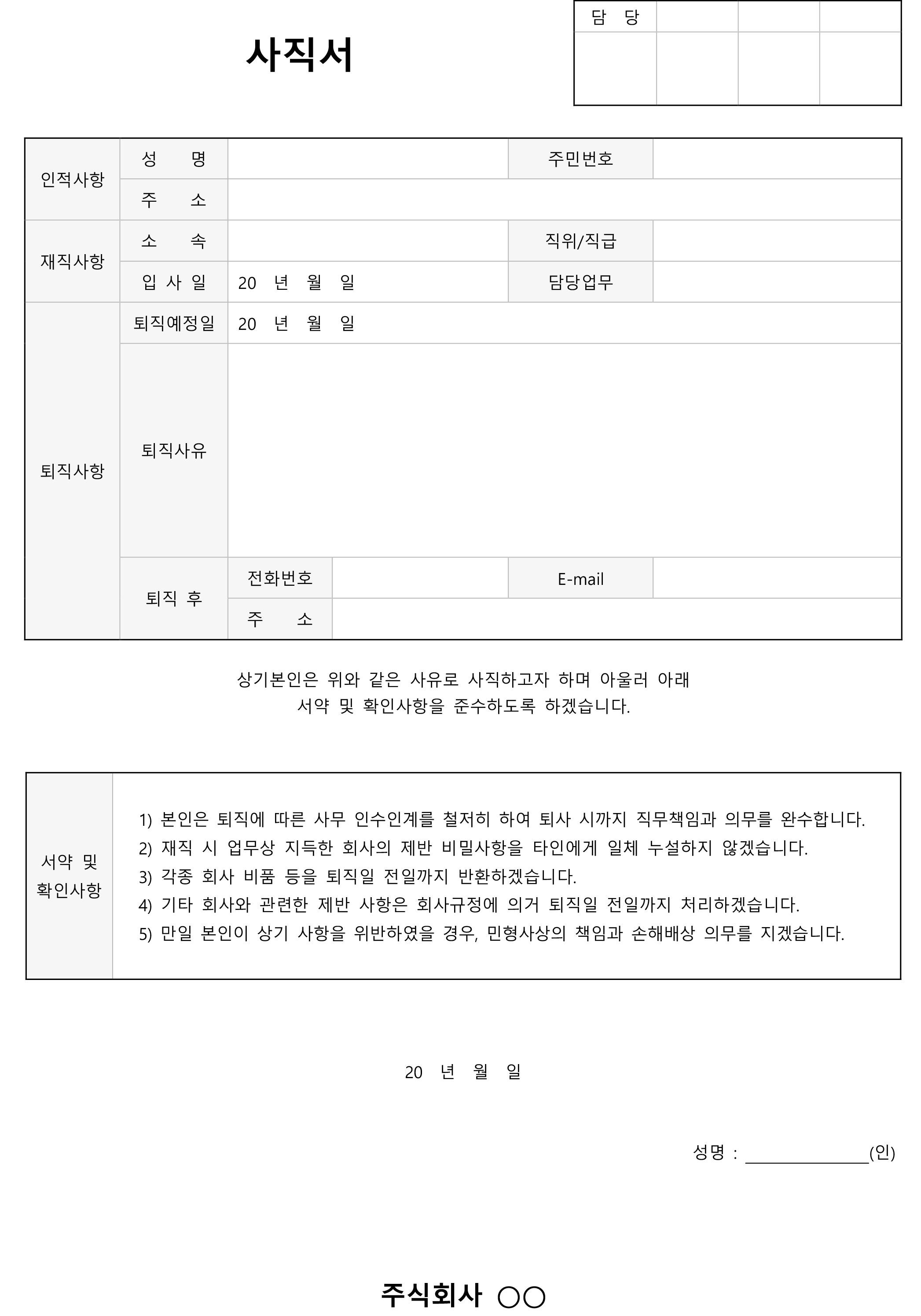 다음은 좀 더 간결하고 깔끔하게 사용할 수 있는 서약 확인사항을 제외한 심플한 사직서 양식입니다.