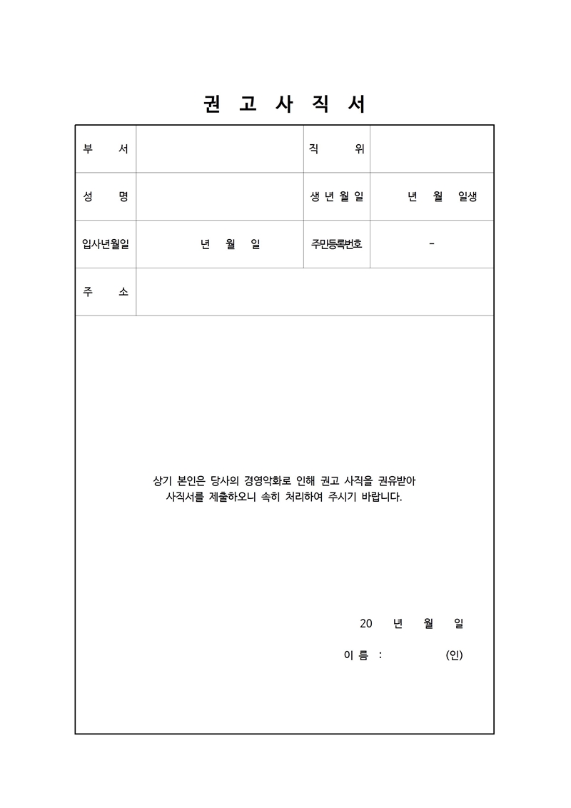 권고사직서 양식입니다. 마찬가지로 위의 글을 방문하시면 됩니다.