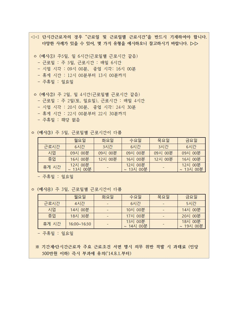 다음은 일용직에 해당되는 단시간 근로자 표준 근로 계약서입니다. 근로시간과 시업, 종업, 휴게시간 등의 기재가 어렵다면 핑크색으로 되어있는 예시 표를 참고하여 기재하시면 됩니다.