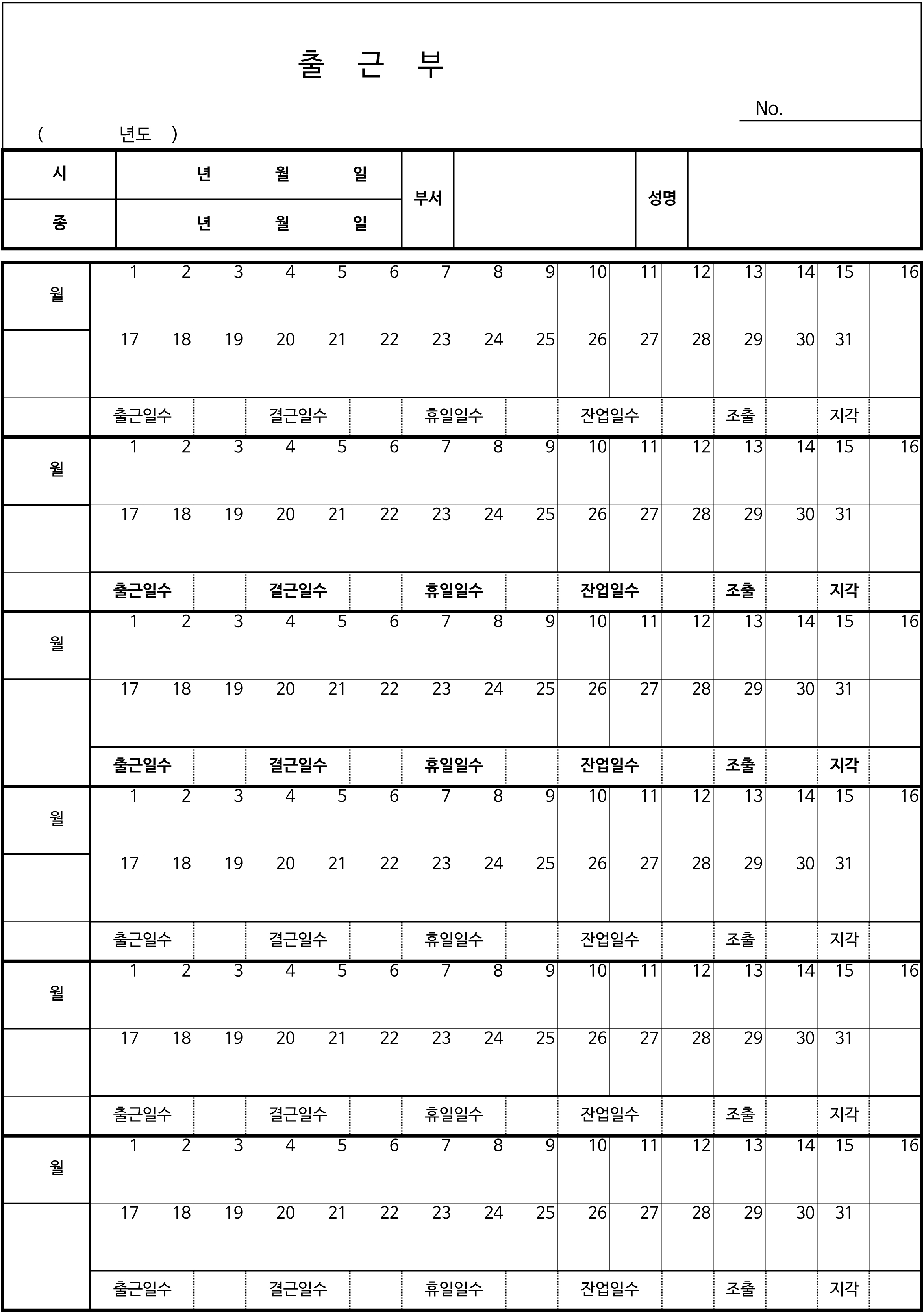 각 주마다 출근일수와 결근일 수, 휴일일 수와 잔업일, 조출(조기출근), 지각 등의 횟수를 따로 기재하거나 해당되는 날짜에 따로 표시를 할 수 있기 때문에 출근부 관리대장이나 근무 상황표 양식, 출퇴근부 양식, 단순 출근 기록부 등 여러 용도로 활용이 가능합니다.