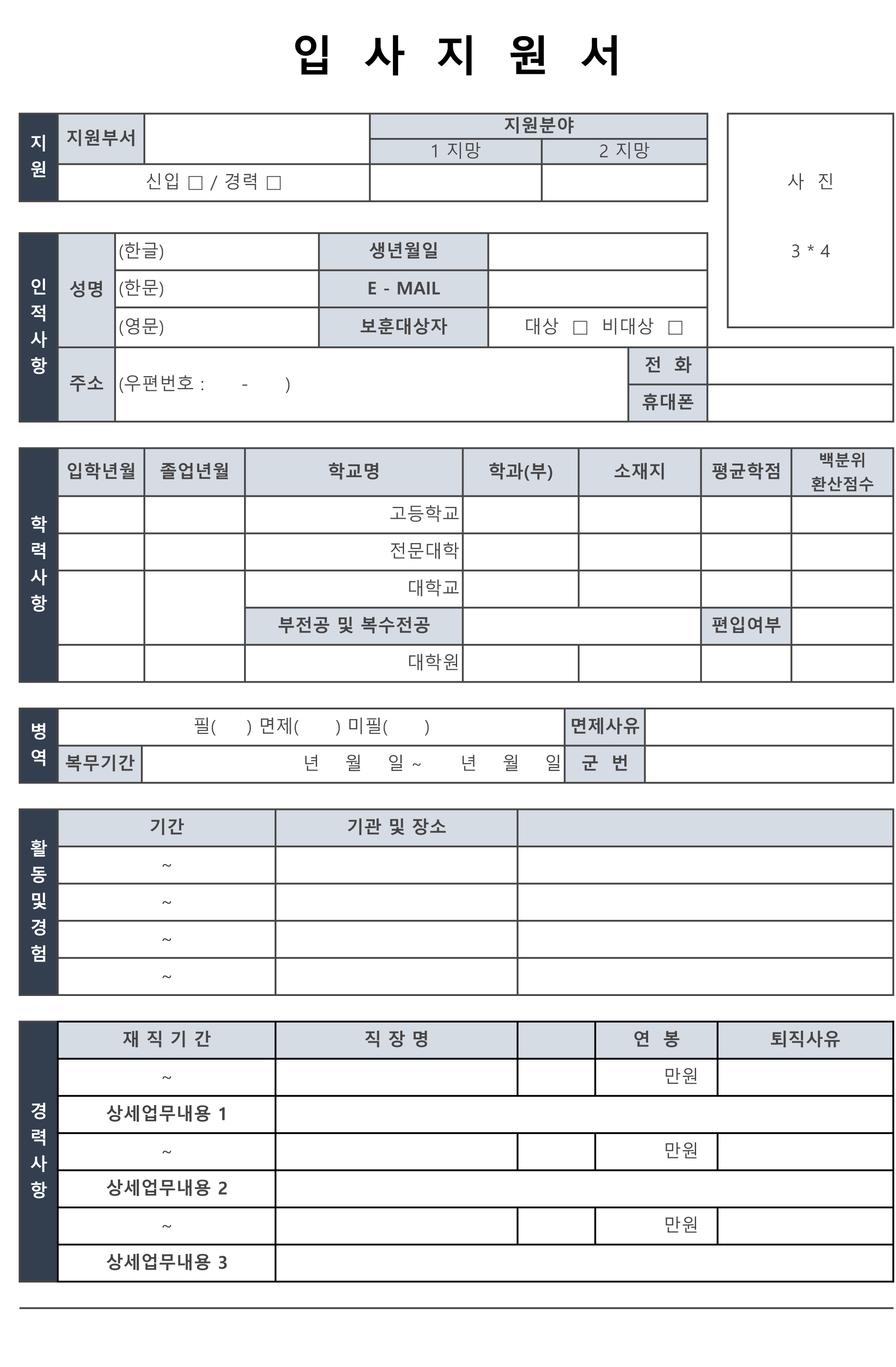 다음은 지원사항과 인적사항, 학력과 경력, 해외경험과 사회활동, 외국어, 병역사항 기타 및 자기소개서 등으로 구성되어 있는 한글 hwp 파일입니다. 마찬가지로 이미지 바로 밑에 첨부된 파일을 저장하시면 됩니다.