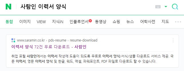 또 다른 방법으로는 국내 구인구직 대표 포털사이트 3사를 이용하는 방법인데요. 장점이라고 한다면 다양한 이력서를 무료 다운로드할 수 있다는 점이 있습니다. 먼저 사람인 같은 경우에는 '사람인 이력서 양식'으로 검색하면 바로 해당 웹 페이지로 이동이 됩니다.