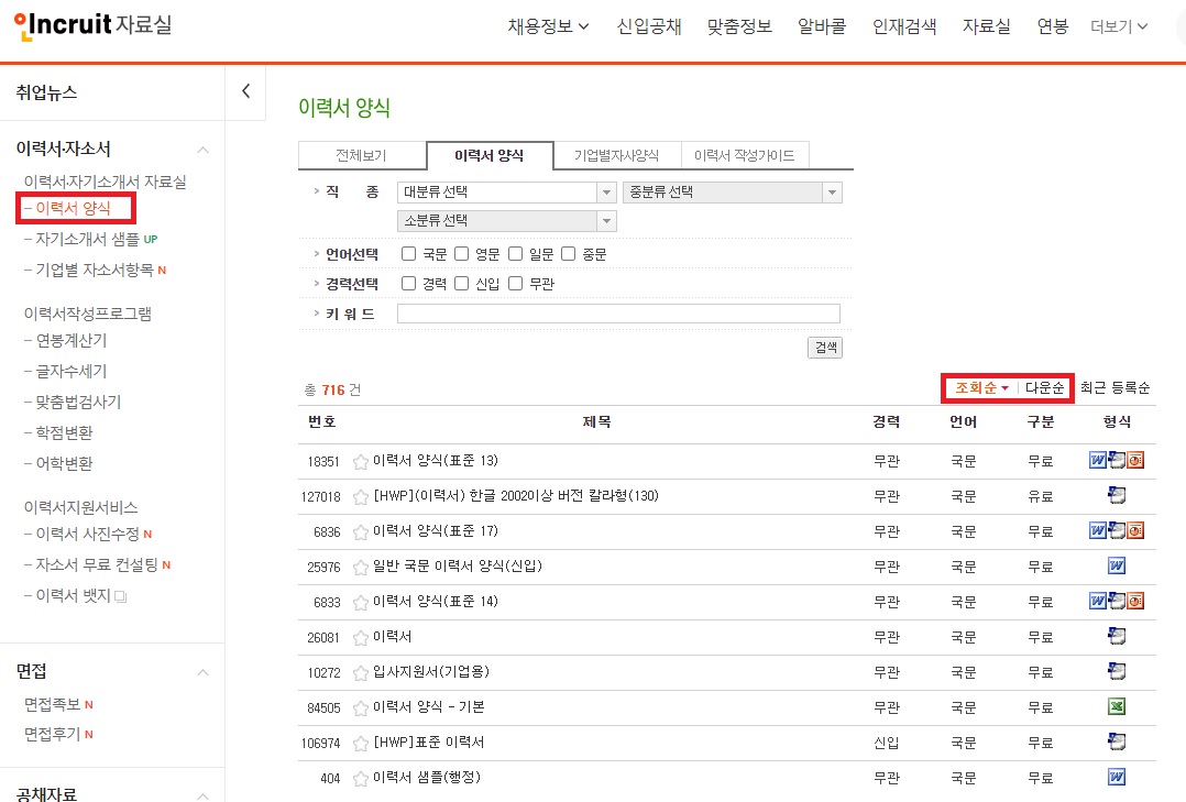 취업자료 카테고리 내로 바로 이동이 되며, 최신순도 살펴볼 수 있고 활용도가 높은 서식을 살펴보고자 한다면 '다운로드 높은 순'으로 보시면 됩니다.