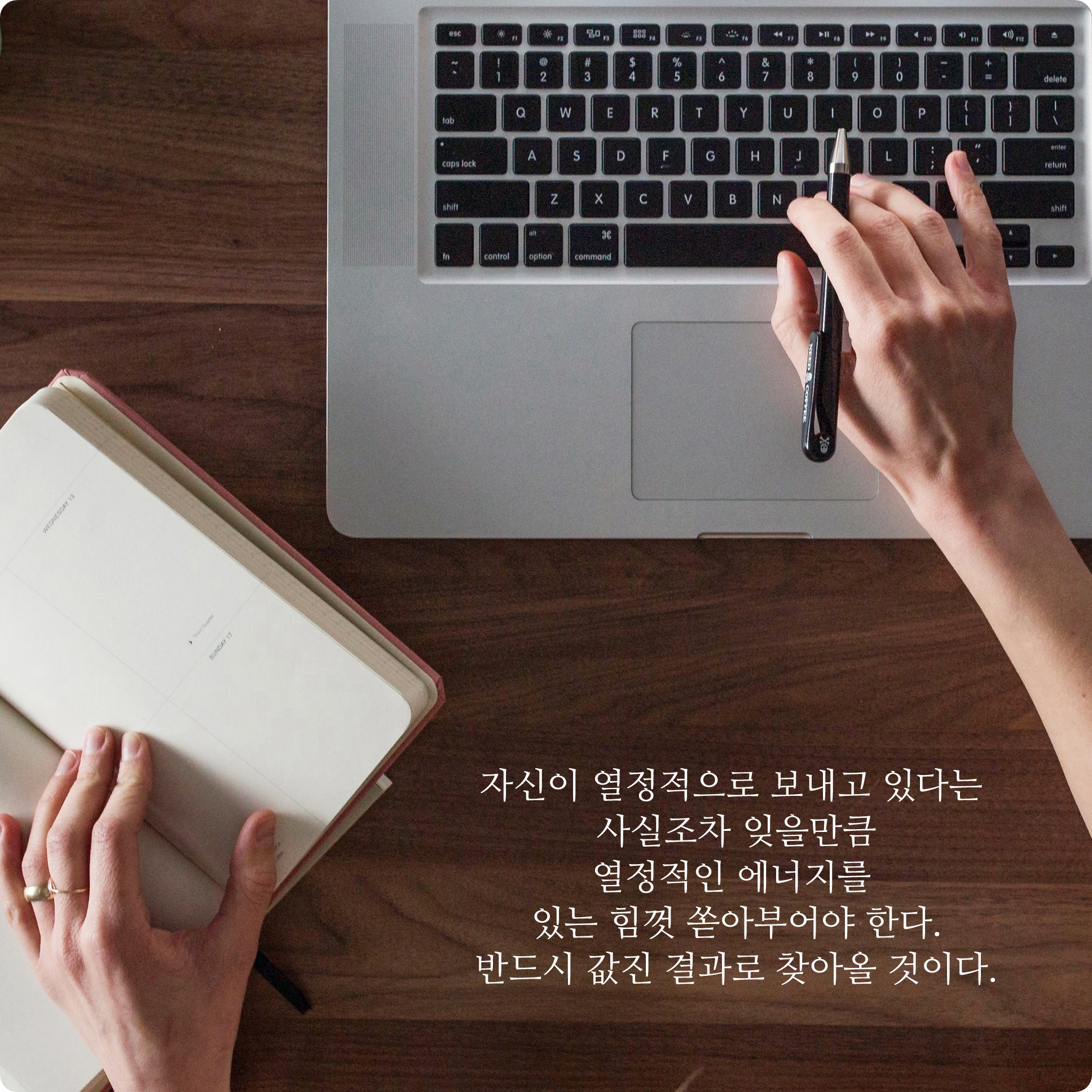 현재의 마음변화 또는 변화를 위한 성공문구가 되었으면 한다. 지금 현재의 내 모습, 나자신의 모습을 바라보면 그렇게 열정적이지 않는 것 같다. 아마 대부분의 사람들이 그렇게 느끼고 살아가고 있는지도 모른다. 하지만 그렇다고 해서 현재의 내가 노력을 하지 않고 방탕하게 하루를 보내고 있다는 것은 아니다. 열심히는 하지만 그렇게 열정적으로 최선의 노력까지는 안하고 있는 것이다. 비록 미묘한 차이이기도 하지만 내가 어떻게 시간활용을 하고 얼마만큼 지속하여 조금 더 노력할 수 있는 그런 마음의 변화가 되었으면 한다.