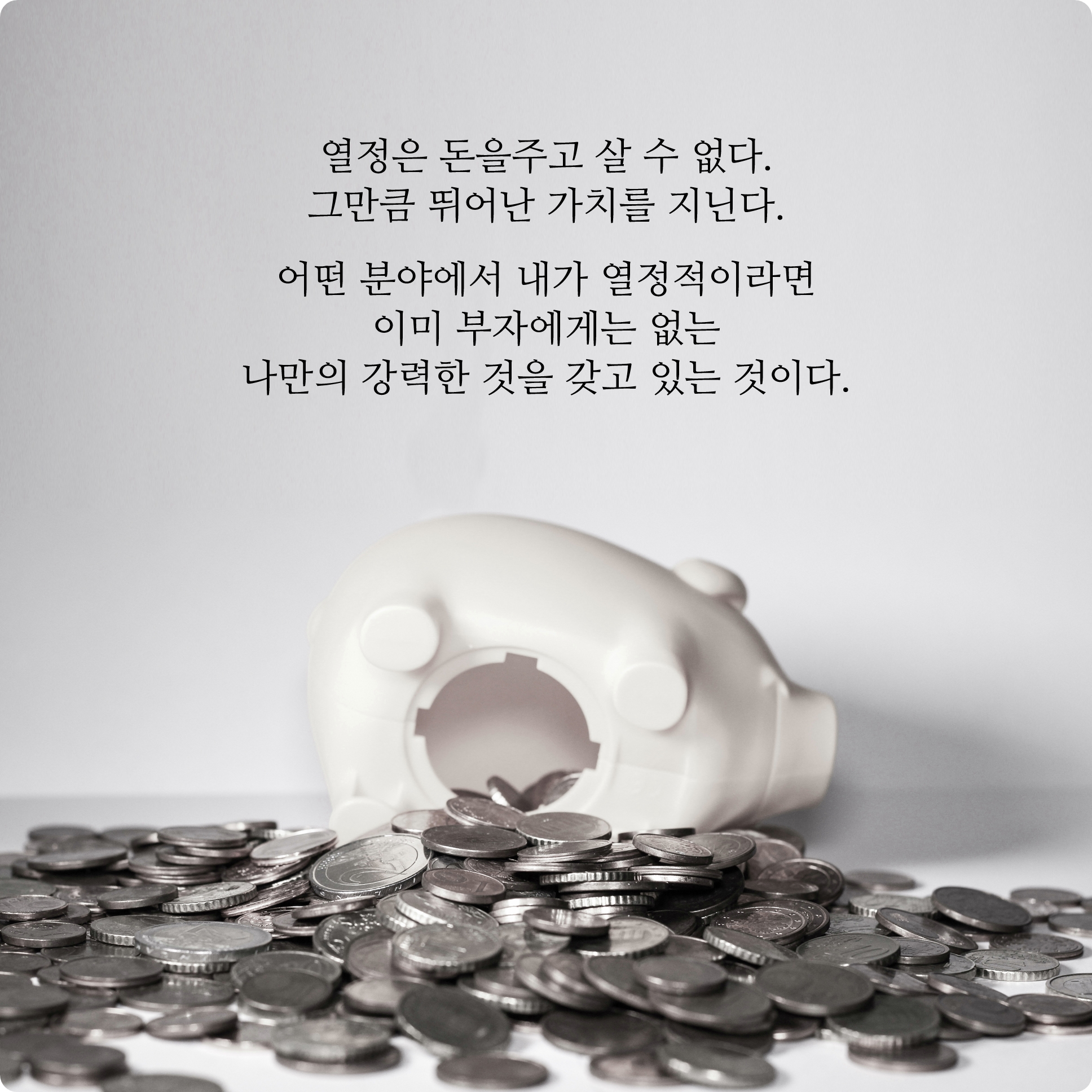 인생에 있어서 돈으로 살 수 없는 것들에는 여러가지가 있다. 그 중 하나가 바로 '열정'이다. 아무리 돈이 많다고 한들 어떤 분야에 흥미를 느끼고 깊이있게 몰입하지 못한다면 인생에 있어 값진 보람, 참된 행복을 느끼기에는 힘들 것이다. 하지만 돈이 없어도 내가 재미를 느끼면서 시간가는줄도 모를만큼 열정적인 시간들을 보내고 있다면 충분히 가치있고 뿌듯한 보람을 느낄 수 있다.