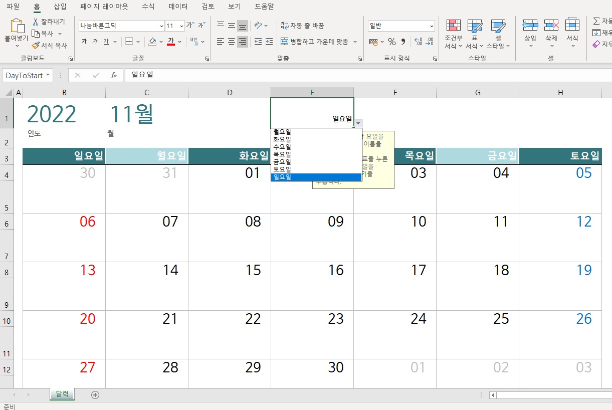 두 번째 자동 달력 : 연도, 요일을 입력하여 변환되는 자동화 달력