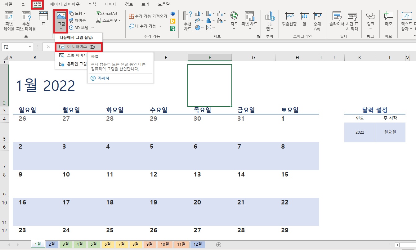 그런 다음 상단부에 [삽입] 탭을 선택 후 위에 체크되어 있는 [그림 아이콘], [이 디바이스~] 파일 순으로 선택하여 내 pc에 저장되어 있는 이미지를 선택하시면 그림이 불러와 집니다. 그림을 삽입하여도 자동으로 변환되는 영향이 없으니 내가 넣고 싶은 테마를 정해 그림이나 사진을 넣고 조금씩 꾸며서 사용하셔도 좋을 것 같습니다.
