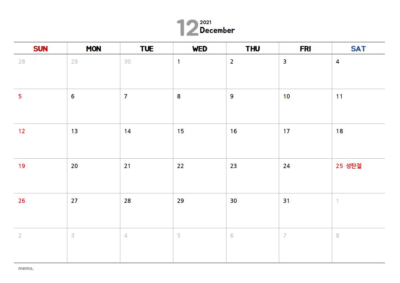 2021년 12월 달력 한글 엑셀 파일입니다. 프린트와 인쇄 출력이 가능하도록 무료 다운로드하실 수 있게 각각 이미지와 함께 PDF 그리고 한글 hwp와 엑셀 xls 파일 순으로 첨부했습니다.