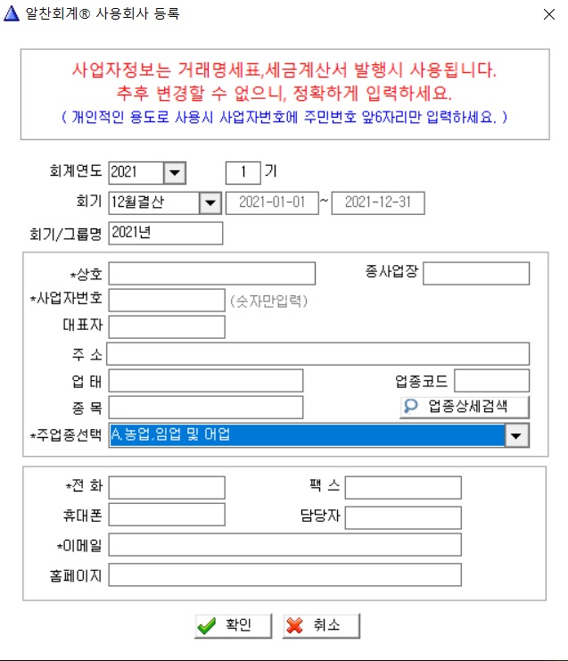 주 업종도 선택을 합니다. 그런 다음 전화와 팩스, 휴대폰과 이메일 등을 기재를 하고 [확인] 탭을 누르면 실제 회계 프로그램 전산으로 넘어가게 됩니다.