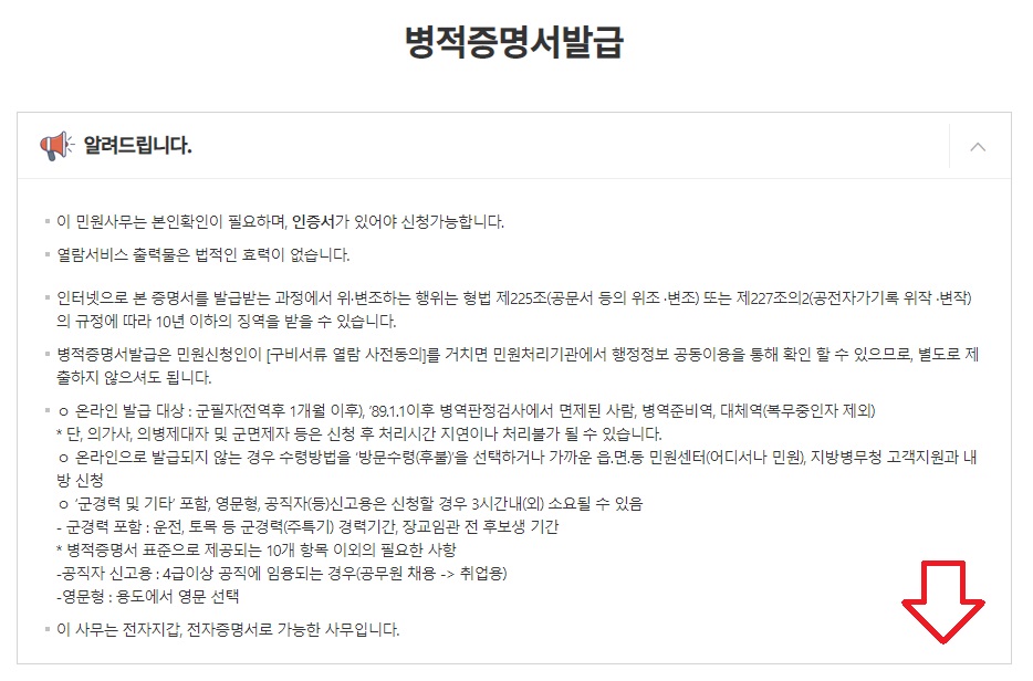 그러면 그다음 병적증명서 발급에 대한 안내문이 나오는데 스크롤을 내립니다.