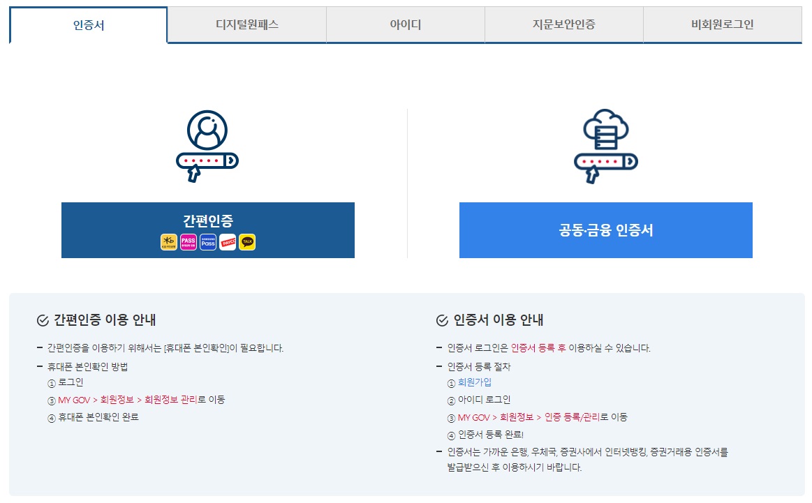 아이디가 있으면 아이디 탭을 누르고 스마트폰에 사용하고 있는 간편인증이 있으면 왼쪽에 간편 인증을 하면 됩니다. '공동, 금융 인증서'로 로그인하는 방법도 있지만 처음 진행해보신 경우에는 공인 인증서를 한 번 더 등록을 해야 하므로, 왼쪽에 간편 인증으로 하는 것이 쉽습니다. 저는 카카오톡으로 인증을 했습니다.