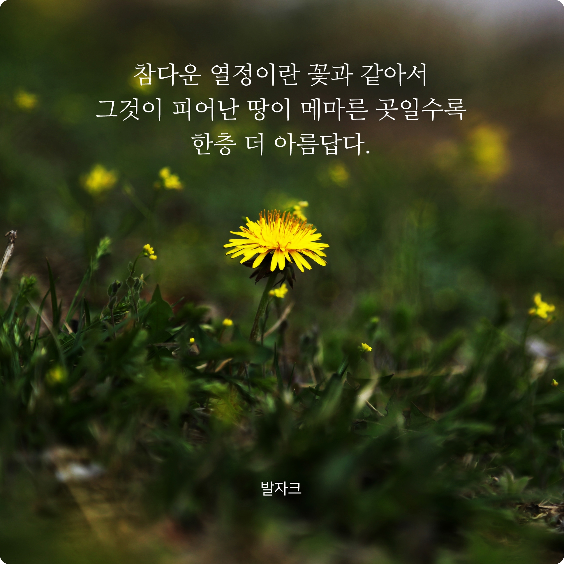 참다운 열정은 메마른 곳에서 피어났을때 더 아름답다는 발자크의 열정명언인데요. 불가능한 환경에서도 이것을 당찬 도전과 철저한 전략을 통해서 불가능을 가능으로 이어지게 한다면 더욱 더 아름답고 의미있는 것이 아닐까 싶습니다.