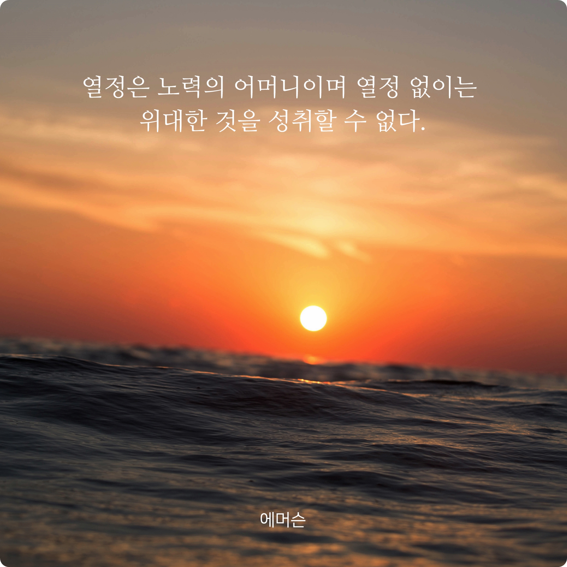 '열정이 담겨 있지 않는다면 그 무엇도 성공에 이르지 못할 것이다' 저에게는 귀감이 될 수 있는 메세지로 다가왔는데요. 내가 의욕이 없고 하기가 싫거나 그 어떤 열정을 보이지 않는 일이라면 그 결과는 너무나 뻔한 것 같아요. 중도에 포기해버리거나 방대한 시간낭비만 할 뿐 이렇다할 좋은 결과를 찾기에는 굉장히 힘들죠. 내가 잘 못하는 일이라도 열정이 생기고 의욕이 생길 수 있는 내가 즐거움을 느낄 수 있는 일을 하는 것이 더 중요하지 않을까요? 이상 오늘은 열정명언들을 적절한 감성 이미지로 편집했던 시간입니다.