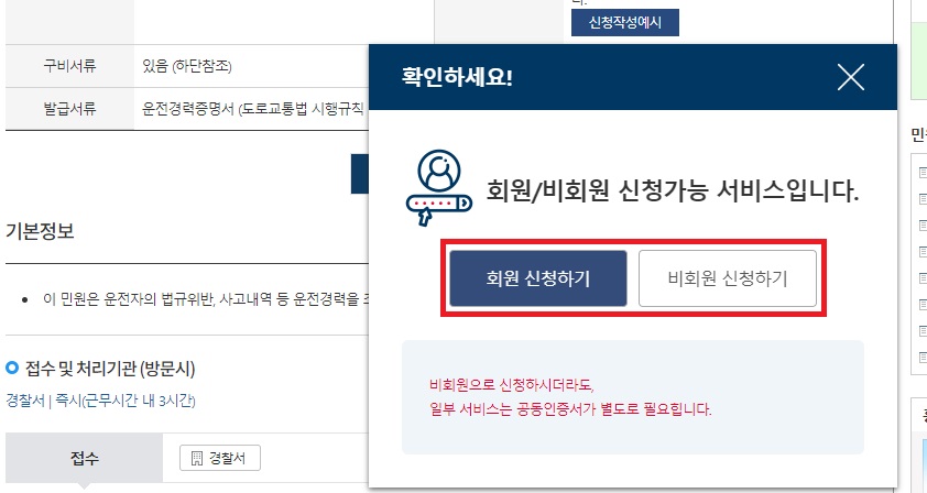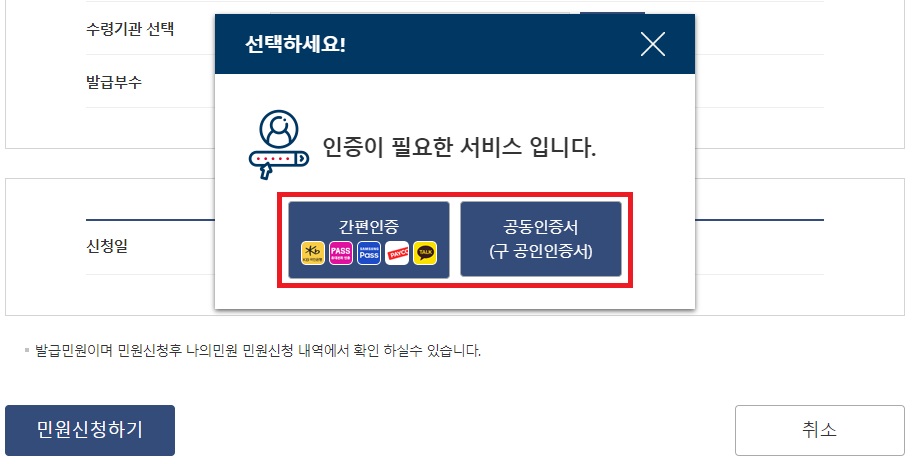 그러면 간편인증 또는 공동 인증서(구 공인인증서)로 인증을 해야 한다는 창이 뜹니다. 공동 인증서는 우리가 과거에 사용했던 공인인증서로 로그인을 하는 것이며, 은행 기관의 인증 앱이 설치되어있거나 카카오톡 모바일 뱅킹을 이용하신 적이 있으시면 간편인증으로 하시면 되고, 공인인증서가 pc나 USB에 설치되어 있으면 공동인증서를 누르시면 됩니다. 저는 공동인증서로 눌렀습니다. 그런 다음 하단 왼쪽에 있는 [민원 신청하기] 탭을 누릅니다.
