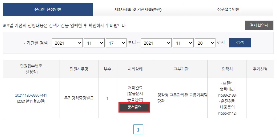 신청한 요일이 주말인데도 바로 출력할 수 있어 좋네요. 우선 문서 출력을 누릅니다.