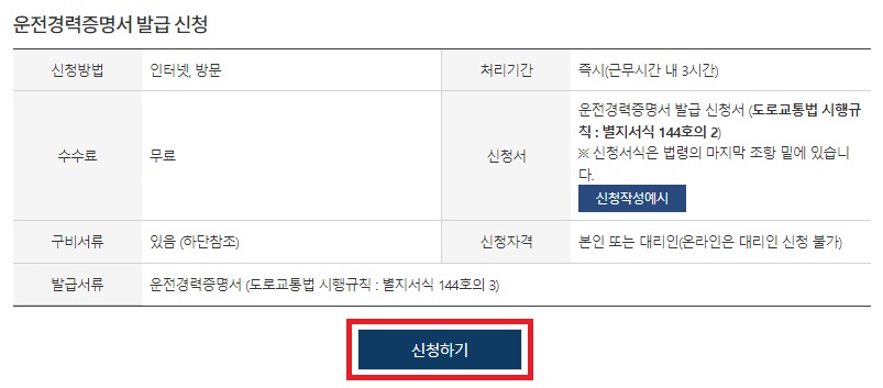 우선 운전경력증명서 발급 신청에 대한 안내 표가 나옵니다. 신청방법은 인터넷과 방문한느 방법이 있고 처리기간은 근무시간 내 3시간이라고 되어있지만 전자문서 같은 경우에는 바로 처리가 되기 때문에 5분 내로 끝나지 않을까 싶습니다. 발급 비용(수수료)은 무료이며, 신청자격은 본인 또는 대리인입니다. 온라인으로는 대리인 신청 불가라고 안내가 나와 있습니다. 간단히 확인을 했으면 신청하기를 누릅니다.