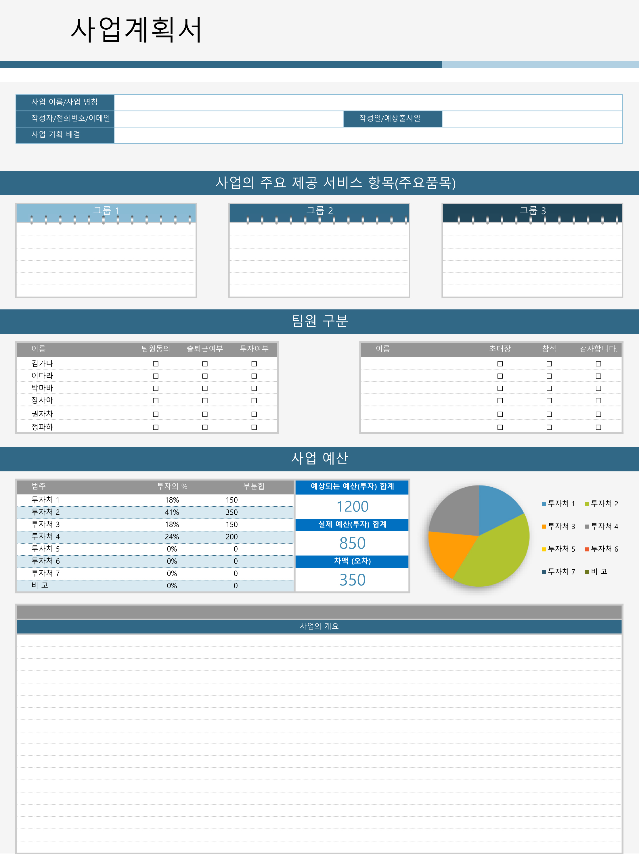 A4 크기 사이즈로 제작되었으며 사업에 대한 예산이나 투자금액을 작성하면 오른쪽에 그래프가 자동으로 완성이 됩니다. 총예산은 얼마인지, 예상되는 예산 투자 합계는 얼마나 되는지 투자처의 비중은 어디인지 등 전반적인 비중을 확인할 수 있습니다.