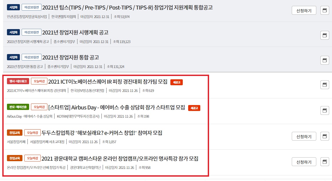 그러면 현재 모집 중인 여러 가지 정부지원에 관련된 스타트업 모집 공고를 확인할 수 있습니다. 여기에서 관심이 있는 공고를 확인합니다.