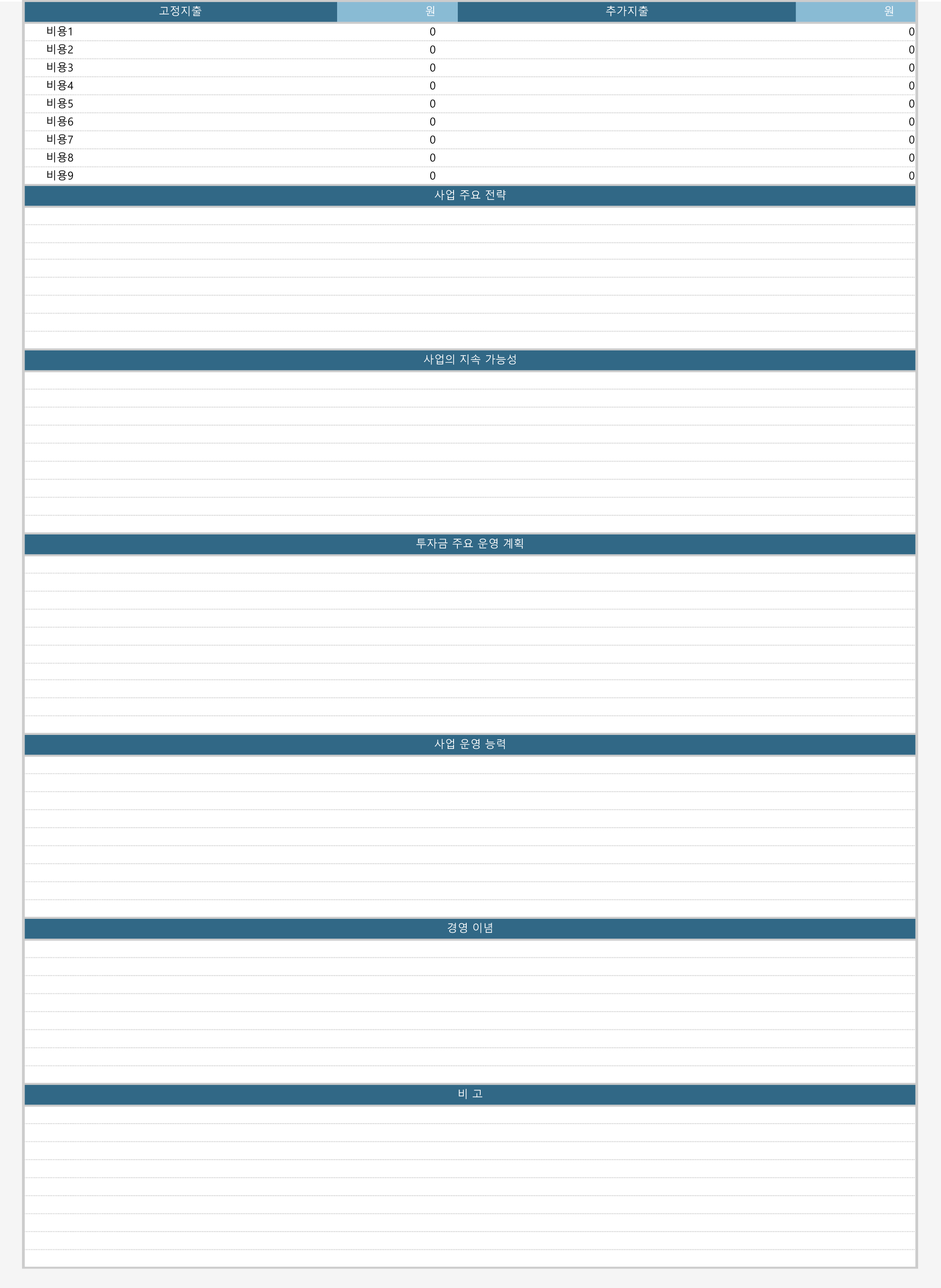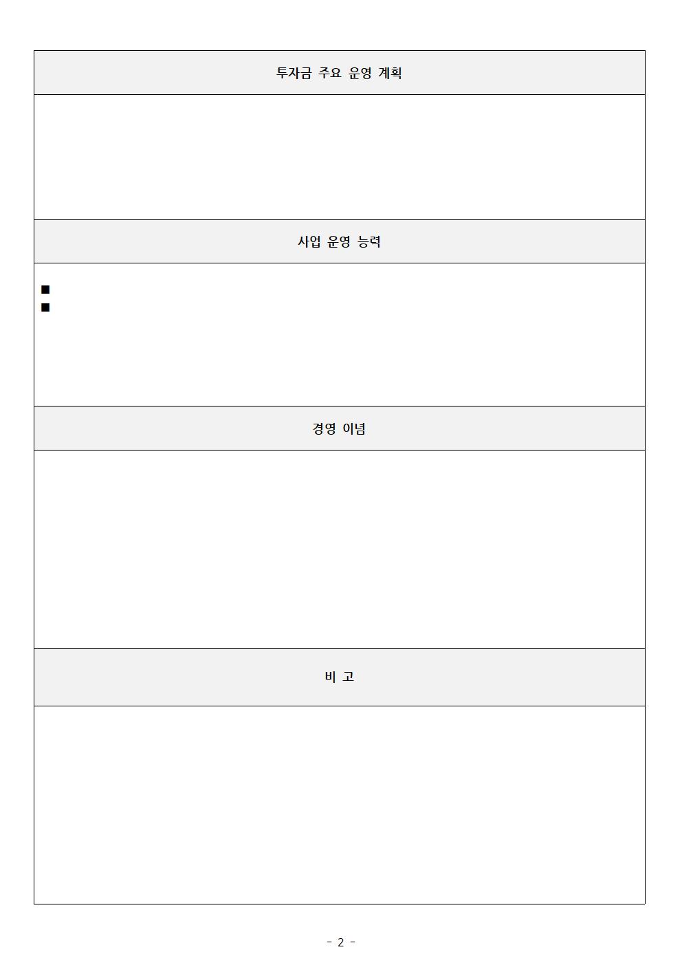 마찬가지로 사업의 개요와 운영 능력 등 병합된 셀들로 나뉘어 있으며, 구분을 하고 싶을 때에는 셀 병합을 풀어서 칸을 만드시는 것도 가능합니다. 또한 엑셀 원본을 첨부했기 때문에 나만의 사업계획서로 수정하여 작성하시면 됩니다.
