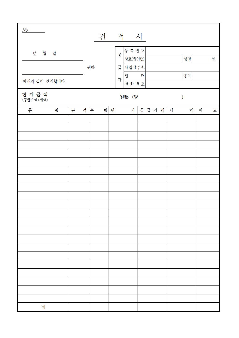 무난하면서 깔끔한 견적서 양식입니다. 공사 견적서 양식이나 이사 건설 건축 등 다양한 곳에서 쓰일 수 있는 여러 서식 디자인으로 구성이 된 깔끔한 견적서 양식입니다. 모두 엑셀 파일로 구