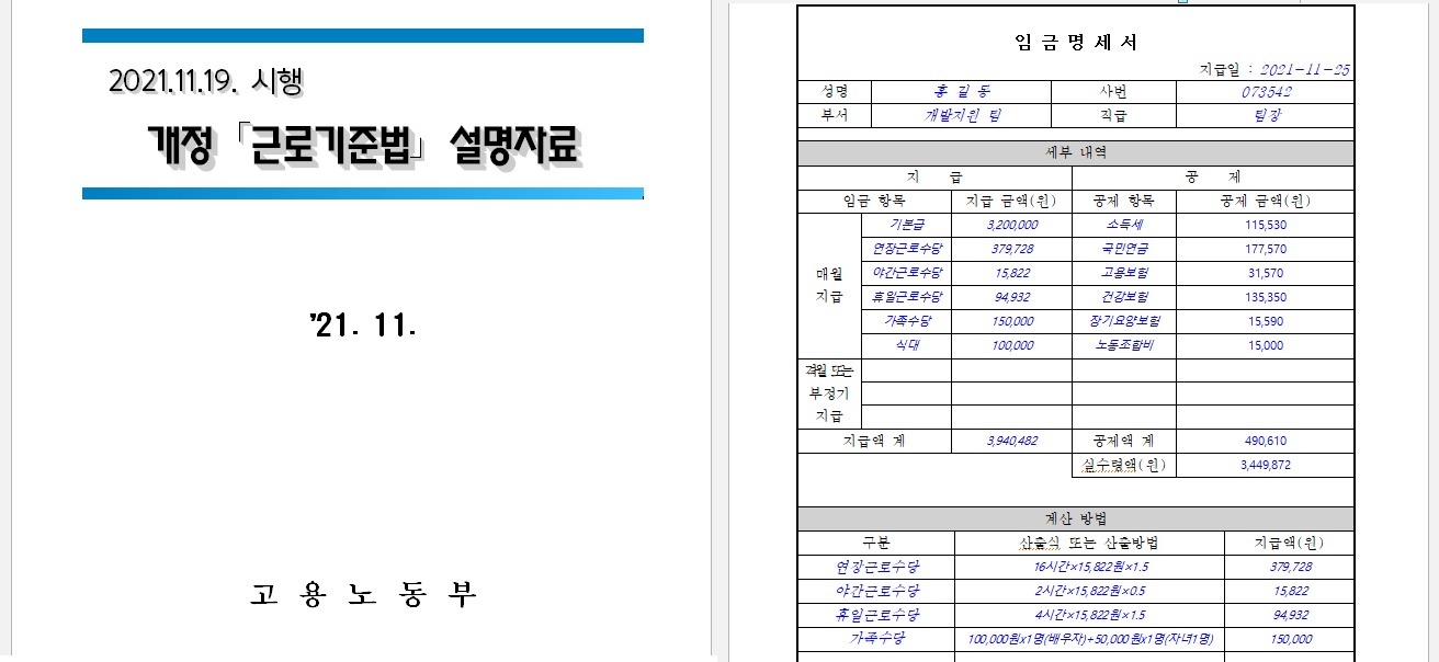 임금명세서 교부 의무화 설명자료를 참고하면서 급여명세서(급여표)까지 작성해보는 시간을 가져봤습니다. 장사를 하거나 기업, 회사를 운영하면서 급여표를 작성하는 경우가 일반적이지만 구