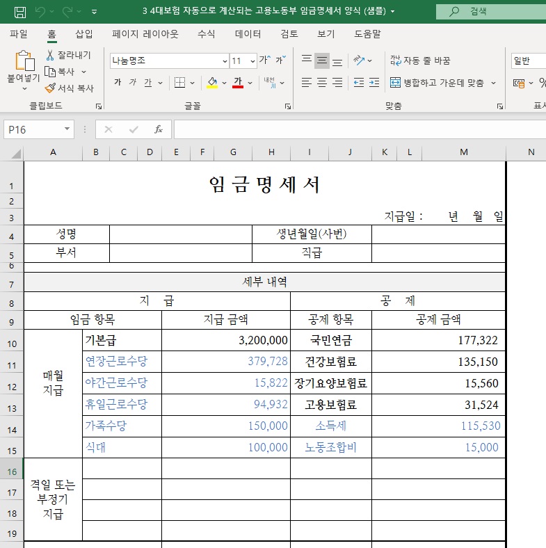 마찬가지로 기본급을 입력하면 파란색을 제외한 검은색 부분은 모두 자동으로 입력됩니다.