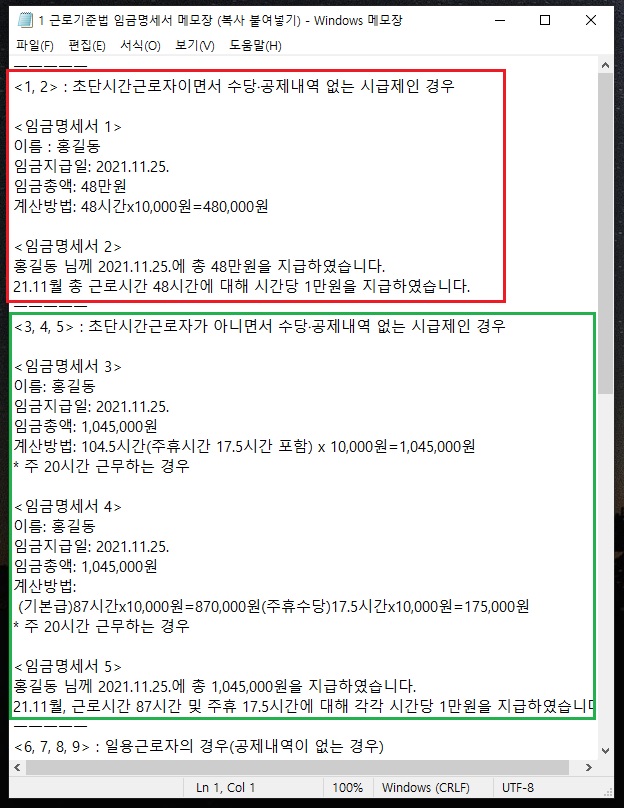 우선 메모장 파일입니다. 설명자료내에 카톡이나 문자로 위와 같은 서식으로 간단하게 작성하여 근로자에게 보내면 되는데 우선 작성을 위해 복사를 하여 수정하는 방식으로 직원에게 발송하시면 됩니다. 해당 파일은 바로 위에 메모장으로 첨부했으며 파일을 열어보면 체크된 빨간색과 초록색처럼 각각 <1,2> 번호에 대한 상황별 설명과 함께 예시 문구들을 구분하여 기재해두었습니다. 다운로드하신 후 메모장을 열어 필요한 부분만 복사하여 활용하시면 됩니다.