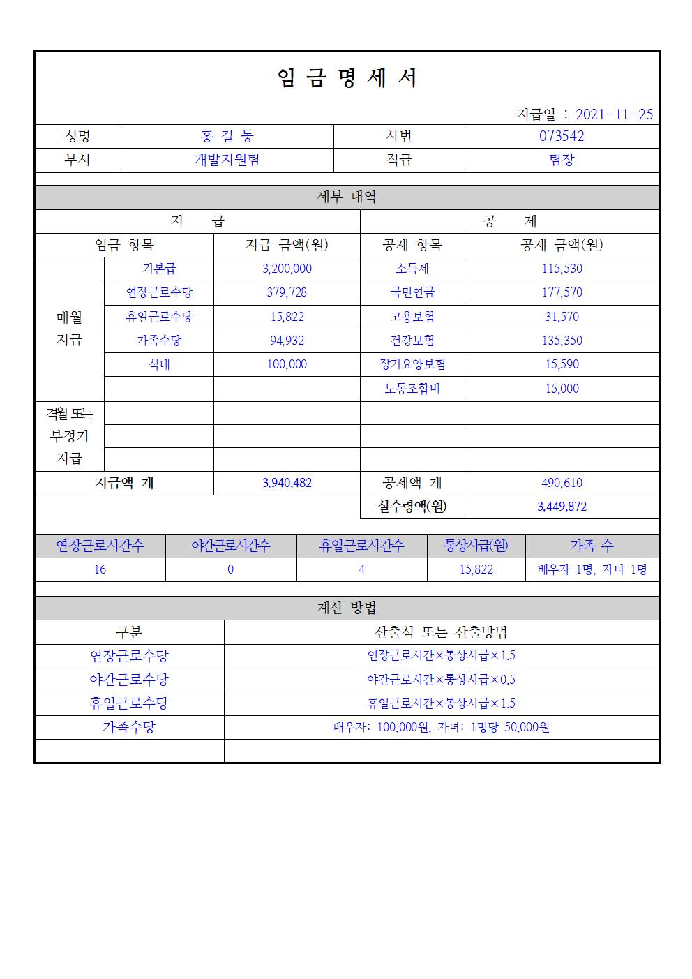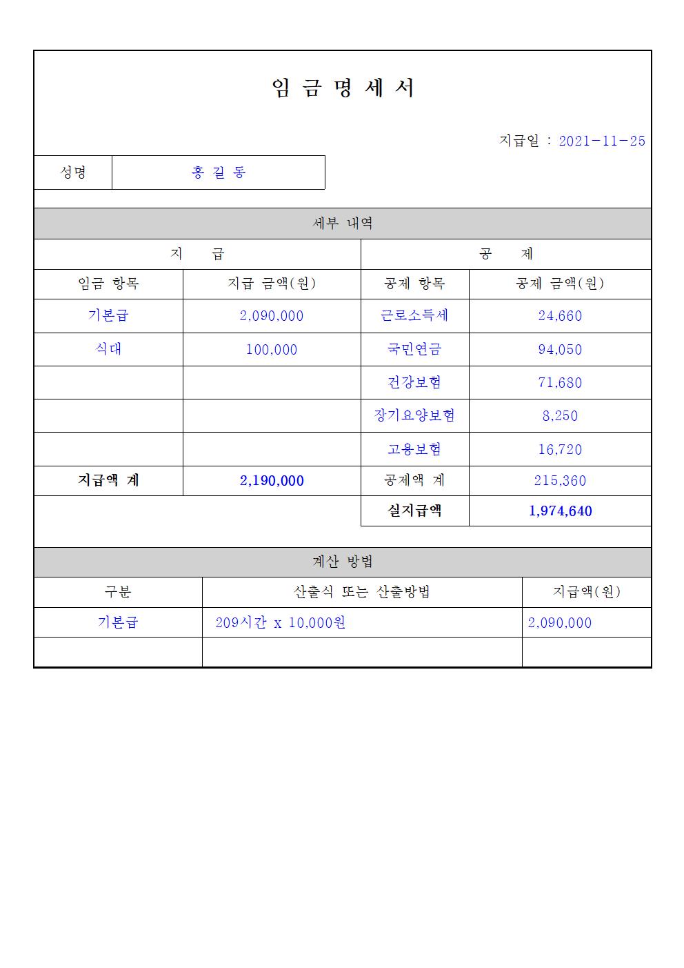다음은 표 구성에 맞게 계산을 하면서 작성하기에 적합한 근로기준법 임금명세서 엑셀 파일입니다. 예시로 작성되어 있는 파란색 부분을 수정해서 사용하시면 됩니다. 아래 5번부터 7번까지 이미지 밑에 해당되는 엑셀 xls 파일을 각각 업로드했습니다.
