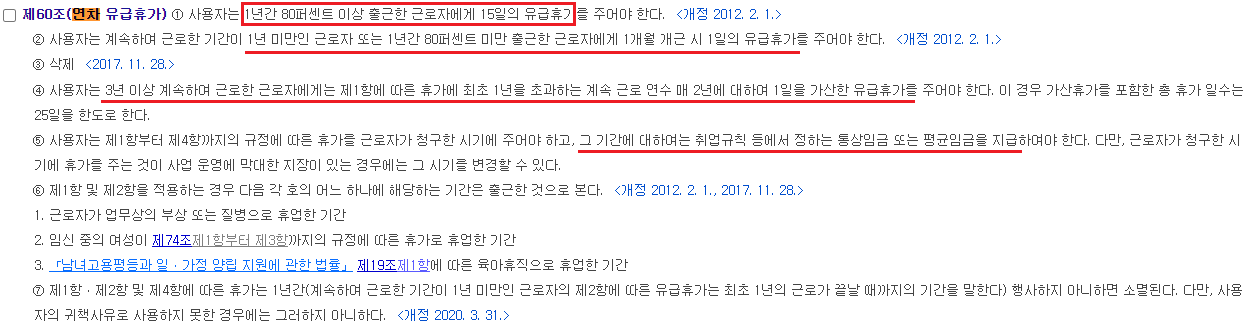 우선 연차에 대한 조항은 2012년에 개정된 조항을 그대로 따르게 되어 기존에 알고 있었던 내용처럼 1년간 80퍼센트 이상 출근한 근로자에게는 15일의 유급 휴가를 주어야 한다고 나와있습니다. (단, 모든 사업장에 연차 제도를 적용하는 것이 아님, 상시 근로자 수가 5인 이상 사업장이며 근로시간도 15시간 이상 되어야 함)