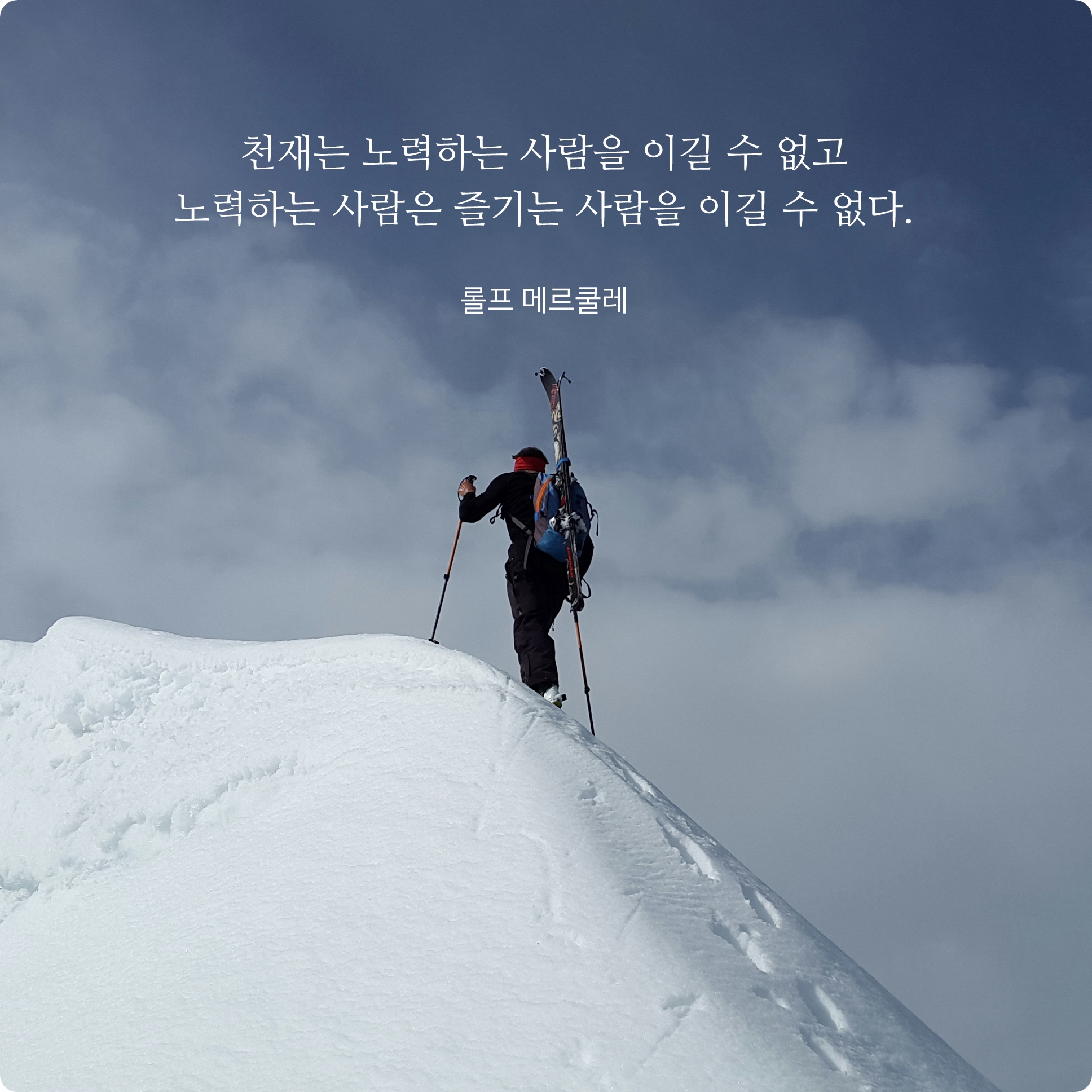 너무나 유명한 노력에 대한 명언이지요. 천재는 노력하는 사람을 이길 수 없고 노력하는 사람은 즐기는 사람을 이길 수 없다는 말. 너무나 공감이 됩니다. 능력이 출중하면서 자신의 하고자 하는 일을 즐기며 노력한다면 금상첨화 아닐까요?