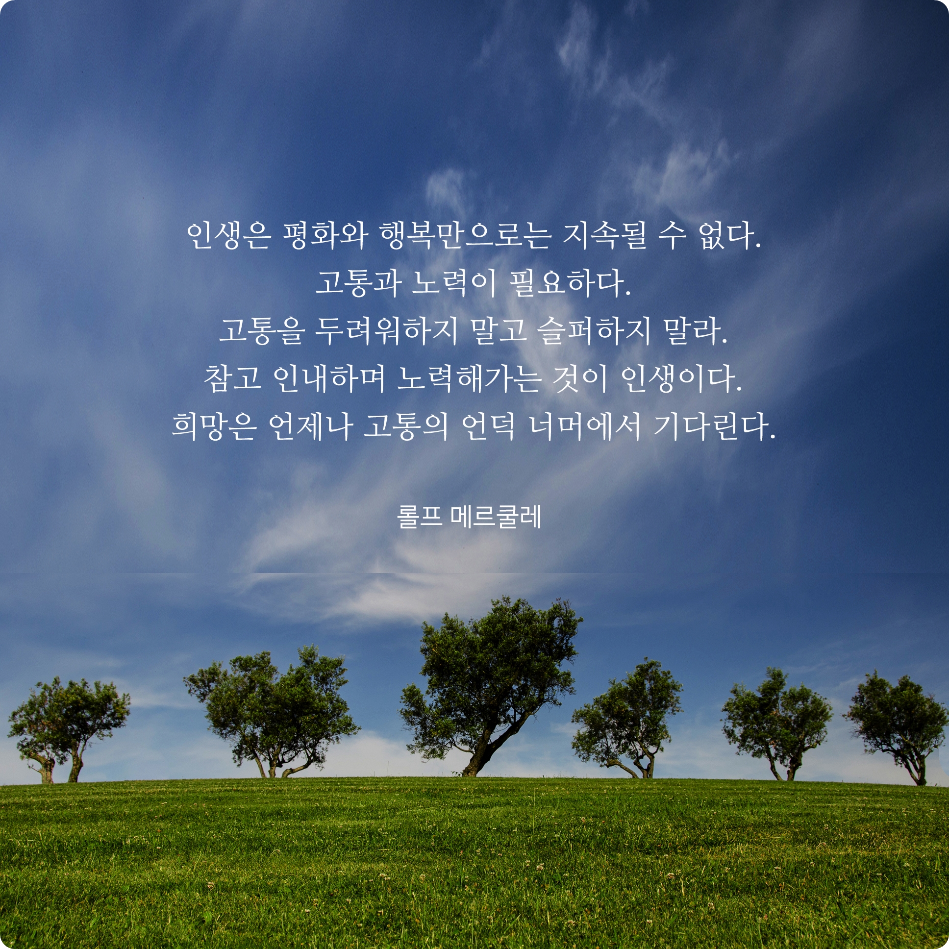 인생에 있어서 고통과 노력은 당연히 필요하다는 그런 뜻인데요. 참고 인내하며 노력해나가는 것이 인생이라고 하였으며, 희망은 언제나 고통의 언덕 너머에서 기다리고 있다고 얘기를 한 명언입니다. 맞는 말 같아요. 인내심을 갖고 묵묵하게 고통을 이겨낸다면 더욱 자라고 성숙해있는 자기 자신의 모습을 발견할 수 있는 것이죠.