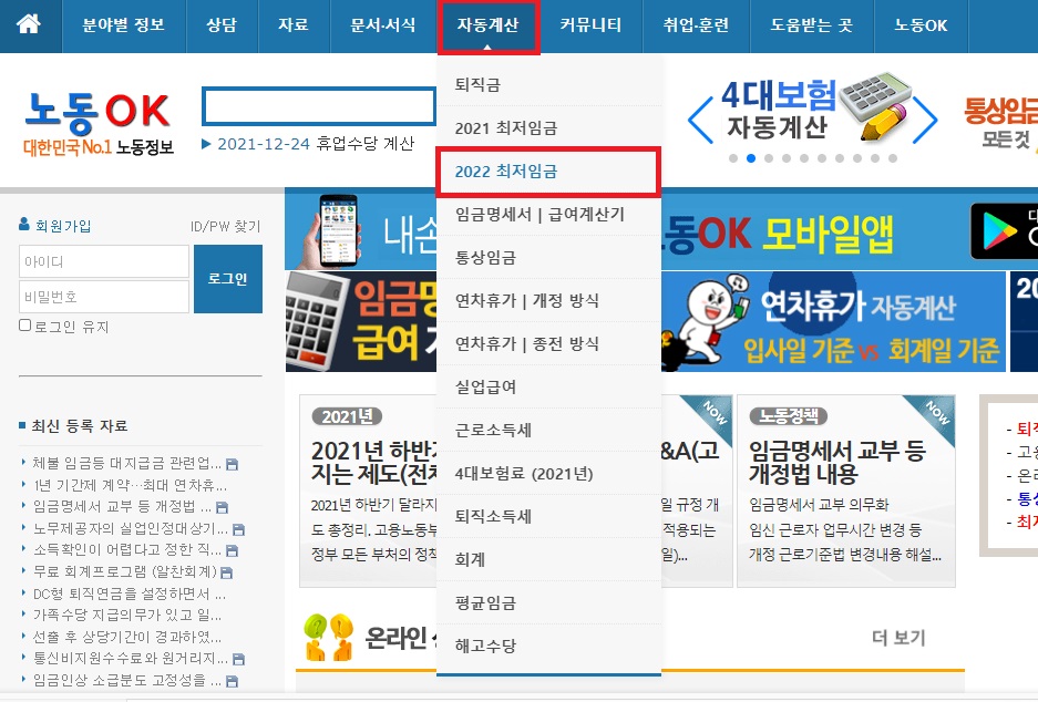 계산기로 들어가는 방법은 상단에 있는 [자동계산] 탭에서 [2022 최저임금]을 누른 뒤,