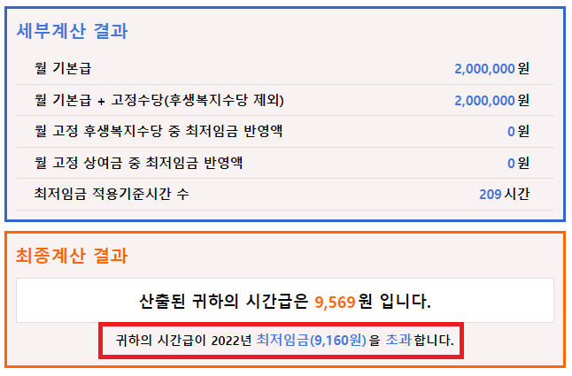 주5일 40시간 기준 최저시급으로 적용했을 때 월급여가 1,914,440원이므로 이 금액 이상이 나오기 때문에 '귀하의 시간급이 최저임금을 초과합니다'라는 문구가 표기가 됩니다. 이렇게 초과된다는 문구가 나와야 최저임금법에 준하는 급여로 나간 것으로 기존대로 지급하면 됩니다. 만약 1주 근무 시간을 선택하고 월 기본급(실제적으로 지급하게 될 월 급여)를 입력했는데 최저임금에 미달이 된다면 '귀하의 시간급이 2022년 최저임금(9,160원)에 미달합니다'라는 문구가 표기가 된다면 지급할 급여를 상향해야 합니다.