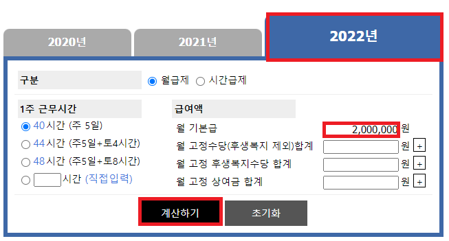 상단에 있는 연도 탭을 2022년으로 선택하여 월 급여를 입력해본 다음 계산하기를 누르면 하단에 최종예산 결과가 나옵니다.
