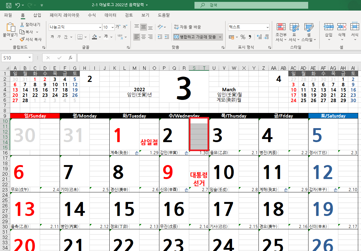 2022년 3월 달력 엑셀 파일입니다. 날짜 밑에 3줄 정도는 기념일이나 메모를 할 수 있는 서식입니다. 대체공휴일로 지정된 3월 9일 대통령 선거 날도 함께 빨간색으로 표기되었습니다. 또한 음력은 15일 단위로 표기가 되어있으며, 하단에 추가 메모란이 구성되었습니다.