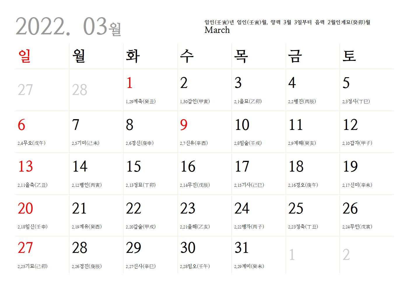 2022년 3월 달력을 프린트 전용으로 인쇄 및 출력이 가능한 엑셀, 한글 원본 파일의 4종을 각각 첨부했습니다.