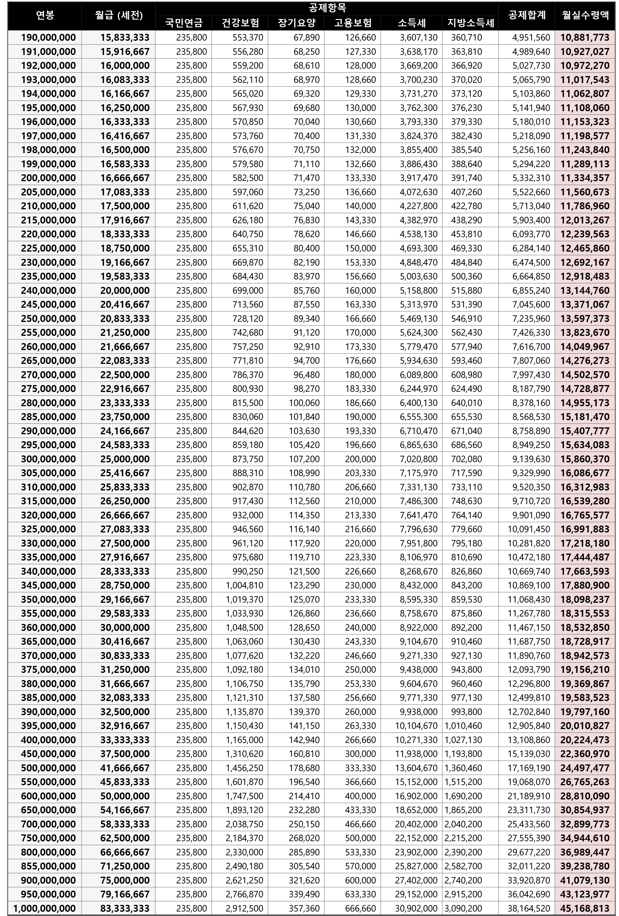 연봉 1천만 원부터 10억까지의 고소득자 2022 연봉 실수령액 표입니다.