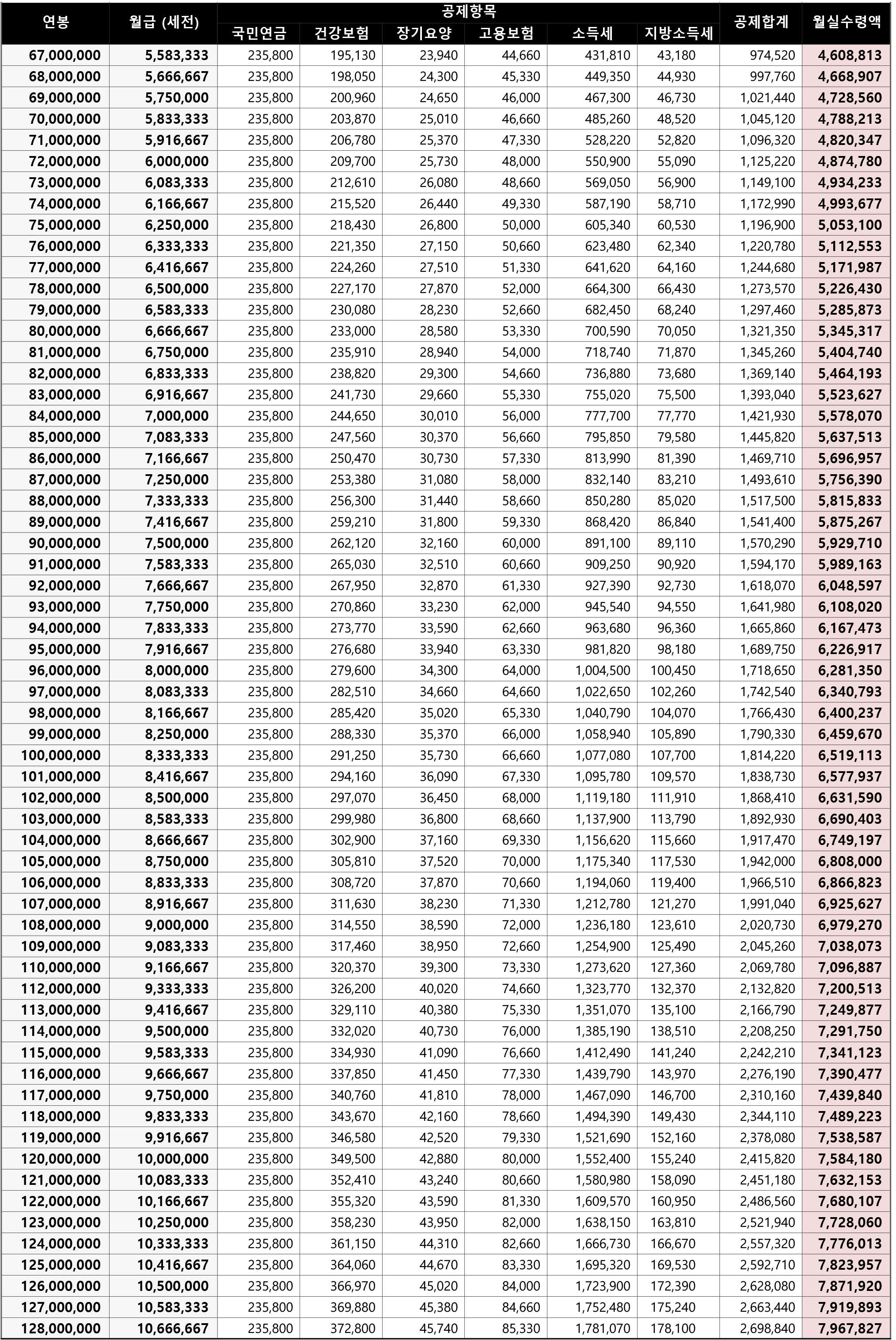 6600만원을 기준으로 한다면 공제금액은 실제로 산출된 금액과 +,- 10만 원 안쪽으로 오차가 있지만 어느 정도 구간에서 내가 실제로 받게 되는 월 실수령액은 어떻게 되는지 확인하기엔 충분합니다. 이어서 아래 6천만 원부터 1억, 2억, 3억, 4억, 5억, 6억, 7억과 8억, 9억 그리고 10억 단위까지 월 실수령액을 확인해보시면 됩니다. (국민연금 월 최대 납부액은 235,000원입니다.)
