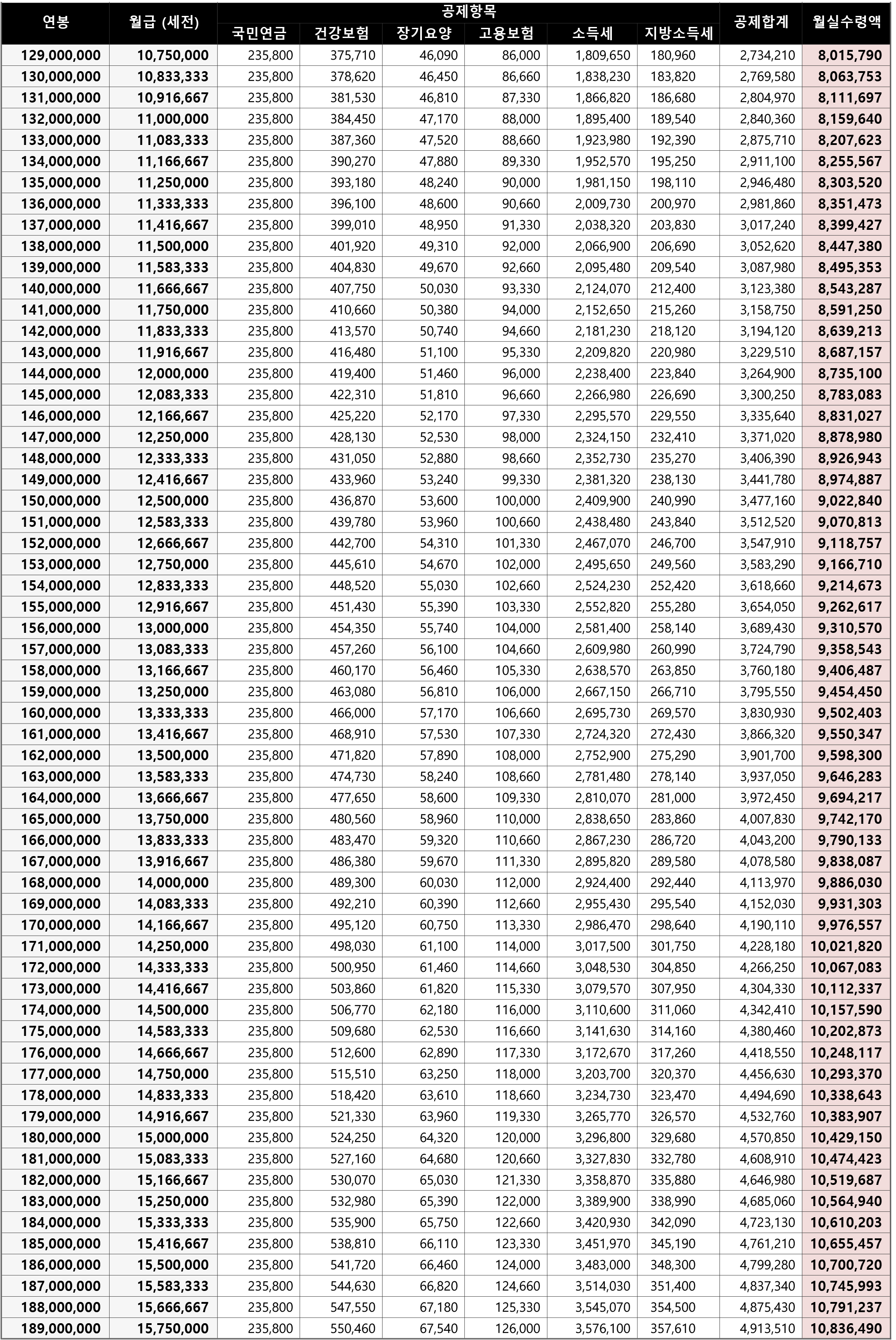 2022년 개정된 세율에 따라 적용이 되었으며, 1천만 원 구간부터 국민연금과 건강보험, 장기요양 보험료와 고용보험을 입력이 되어있으며 1인 기준 간이세액표를 근거로 한 소득세와 지방소득세가 계산되었으며, 각 세목별 합산된 총 공제 금액, 그리고 실제로 받게 되는 월 실수령액이 각각 정리되었습니다.