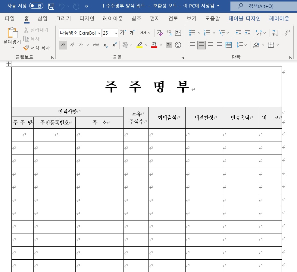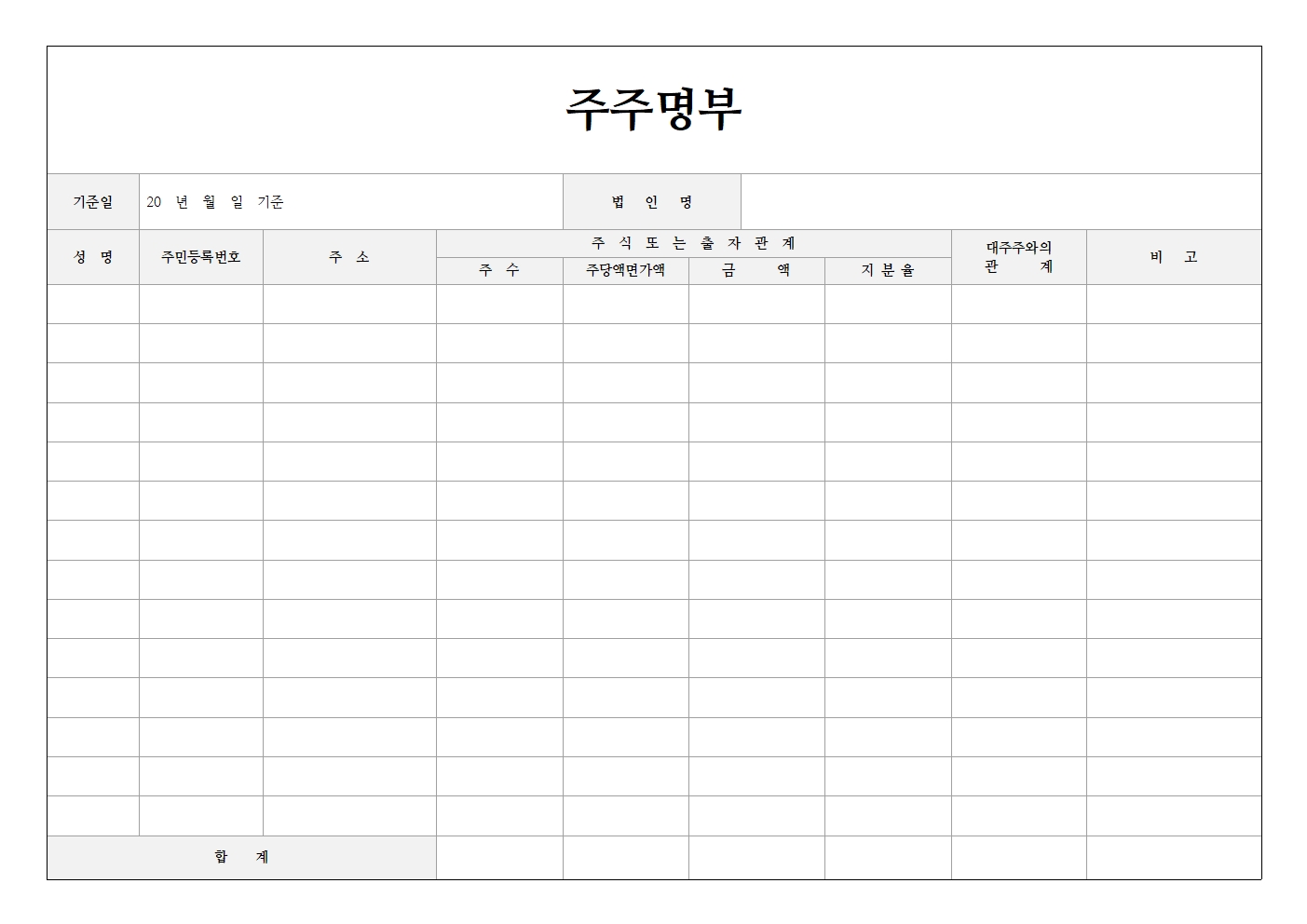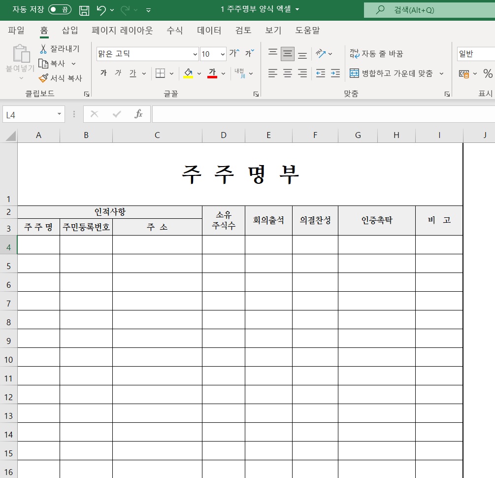 해당 주주명부 양식을 엑셀로 제작한 파일입니다.