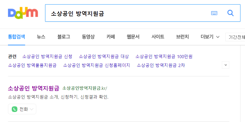 소상공인 방역지원금을 신청하기 위해서는 각 포털 사이트마다 다르지만 공통적으로 '소상공인 방역지원금'으로 검색하시면 됩니다. 포털사이트 다음에서 검색했을때의 화면이며, 소상공인방역지원금.kr로 된 사이트를 방문하시면 됩니다.