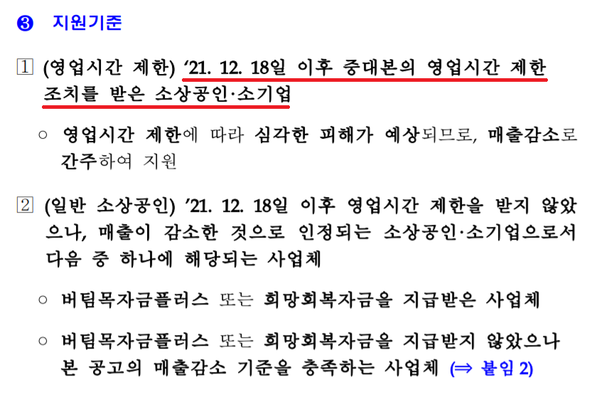 지원기준으로는 2021년 12월 18일 이후에 중대본(중앙대책본부)의 영업시가 제한 조치를 받은 소상공인과 소기업인데요. 여업시간 제한 조치로 인해서 해당 소상공인, 소기업들의 매출감소가 일어난 것으로 보고 지원이 됩니다. 또한 2021년 12월 18일 이후에 영업 시간 제한을 받지 않았어도 매출이 감소된 것으로 인정이 되는 소상공인과 소기업도 해당이 된다고 합니다. 버팀목자금플러스와 희망회복자금을 지급받은 곳 그리고 이 두 자금을 받지 않았어도 매출감소를 충족하는 사업체가 해당이 됩니다. 때문에 내가 전에 버팀목자금과 희망회복자금을 받았는지도 확인을 해볼 필요가 있습니다.